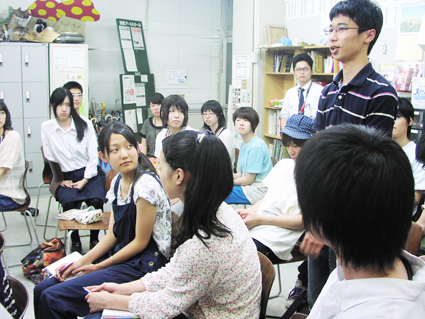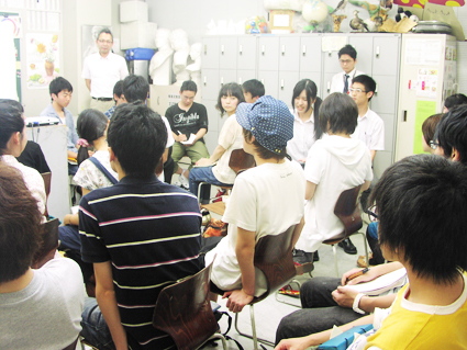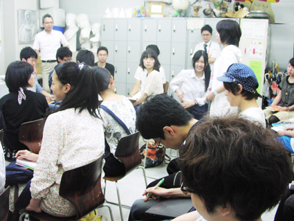 05 July 7/4京都造形芸術大学合同授業「デッサンの鬼」報告 7/4(水)は 京都造形芸術大学との合同授業「デッサンの鬼」がありました! 授業の様子をサイトウがご報告します。 京都造形芸術大学のアートリンクセンターより、 石山潤先生と、北野諒先生にお越しいただき、 「対話型鑑賞」という授業をしていただきました。 まず最初は、導入として「言葉で描写すること」を体験。 目の前にあるものを、 それを見たこともない人に、言葉を使って説明します。 言語化し、他人にも共有できる情報に落とし込むというのは、 客観視するということですね。なかなか苦戦。 実は通じてると思ってるけど、全然通じていない。 通じないともちろん共感もしていない。 そのズレにも特に気付かず、会話をした気になる。 んーん、これはそこら中で起こっている、ぞっとする話…。 いよいよ対話型鑑賞。 作品を観て、気付いたこと、感じたことを発言します。 人によって見え方が違うことが実感できました。 同時にコミュニケーションをとるとけっこう共有もできると思いました。 みんなはどうかな? 最後はグループディスカッション。 なかなか白熱しているところもあって、素敵でした。 授業を通して、 「頭がいい」とか「賢い」って「客観視できること」だなと思いました。 「こういう意見が出てくる可能性がある」と可能性を考えられるか。 それが考えられると、人がびっくりする発想がなにかも考えられる。 その上で、決断できるか。 その上で、温かみを持って、心地よいタイミングで他人に伝えられるか。 善く生きていく ことは難題だらけですね。笑 あのあと石山先生たちと話している中で、 神がかり的名言がたくさん出てきました。厳選した1つを紹介します!笑 人は自分と違う。それは当然。 そのことをどう乗り越えるかがクリエイターの仕事なんだ。 おされー <サイトウ> [0回] 2012/07/05 (Thu) 19:06 アスクイベント Comment(0)