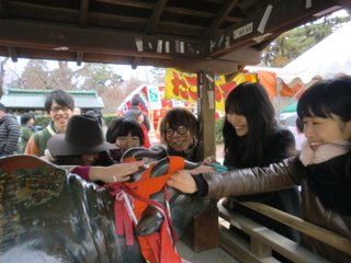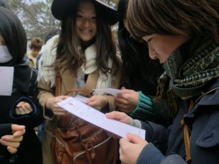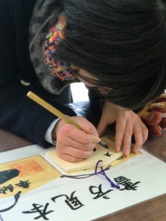 07 January 初詣(北山教室) と 美術系高校実技模試! こんにちは。年明けとともに雪がちらつく日が増えましたね。マシヤマです。1/4(水)に北山教室からも初詣に参りましたので、その様子を紹介します。行き先は学問の神様がいることで有名な【北野天満宮】です。『北山教室に集合組』はバスで先生たちと移動。(生徒3名+先生4名)思えば、この時はまだ晴れていて暖かくすらありました。この数時間後に、あんなに雪が降ろうとは……。北野天満宮前にて、『現地集合組』と合流。(生徒10名+先生1名が合流で総勢18名)屋台の誘惑を余裕で通り過ぎ……本殿への参拝をおこないます!目的は受験の合格祈願ですから!!! 巨大絵馬の下で集合写真。おみくじも引く。今年は『小吉』と『大吉』が多かったように思います。 T先生だけがなんと『凶』でした!このあたりで雪が降りはじめたのでした。最後に皆で一文字ずつ、絵馬に文字を書き込み……。なかなか力強い出来栄え☆ これも余白とのバランスを見る『構図の力』を試されている?!一番良い場所に奉納。この絵馬は京都アートスクールのすべての受験生のために書きました。NET生、講習生、美術高校受験生、みんなのことを思って祈っています。←『(あ)ま酒』最後に、凍えた身体を甘酒で温めました。写真にはまだ写っていませんが、この直後、本格的な雪が降り始めたのでした。驚くほど薄着だったMさん、あの後大丈夫でしたか?みんな風邪をひかずに乗り切ってほしいと、切に願います。 さて、話は変わりますが、1/9(月)には美術系高校を受験する生徒を対象とした『美術系高校実戦実技模試』がおこなわれます。詳細はこちら→■■■大学受験生とともに、中学3年生も頑張っています!現在、北山教室での受験予定者は15名。中学生の皆は緊張すると思いますが、楽しむ気持ちで受けてください。当日の様子は、またこのブログにて報告いたします。<マシヤマ> [0回] 2012/01/07 (Sat) 17:16 アスクイベント Trackback() Comment(2)
