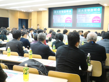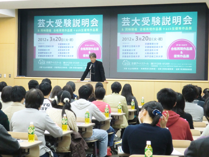 21 March 3/20芸大受験説明会! 3/20(火・祝)はキャンパスプラザ京都にて 芸大受験説明会が行われました。 定員を超える120名の参加でした。 遠いところ、お忙しいところ足を運んでいただいてありがとうございました。 説明会を行ったあとは、別会場にて作品展や個別相談会。 質疑応答の時間で、とくに京都市立芸大の次年度の試験の変更について お聞きしましたが、まだ「着彩」なのか「色彩」なのか、 細かいことは公開できないようです。 ただ、5月頃には正式に京芸から発表されるとのことでした。 「科目数が多い」「併願しづらい」という意見にこたえて、 科目数を減らしたということのようですね。 これは説明会のときには話しに出ませんでしたが、 センター試験を減らさないというのはポリシーのようですね。 考える力や一般的教養を持っていることと、造形力の両立。 そうやって受験時代を過ごしてほしいという京芸の意向です。 受験生は「科目多いがな…」と恨めしいかもしれないけど、 そのポリシーを理解して実直に頑張って欲しいです。 もちろん今後、センターの科目が変動することもあるかもしれないですけども。 アスクの考え、大学の情報、実際の作品… 得るものがあったでしょうか。 ひとまず、本格的に春期講習が始まって2013年度試験モードが始まります。 結果がそろそろ出揃った頃。 出会いの季節、お別れの季節。 今日は今から、北山・彦根 各教室で合格祝賀会&激励会 です^^ <サイトウ> [0回] 2012/03/21 (Wed) 17:25 アスクイベント Comment(0)