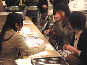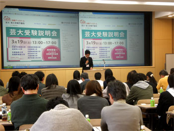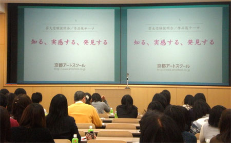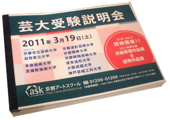 23 March 芸大受験説明会&作品展 報告 前回のブログ、動画の授業!すごいですね!!七条教室には、春期講習ならではの新鮮な風が吹いてます。さて、こちらは北山教室の様子です。京都市立芸大対策のクラスでは、2月に行われた京芸入試問題に関連した授業をしています。春期講習で初めましての生徒がいっぱい…広島から来た二人と昨日少しですが、話しました。京都でどこに行こうかな…という話。遠くからお越しの皆さんは、せっかくなのでアスクの講習と同時に京都を満喫しないとですよね。さて、3/19(土)にキャンパスプラザ京都にて説明会&作品展を行いました。ご来場いただきました皆様、ありがとうございました。写真にて会場の様子をご紹介したいと思います。 今回のテーマは「知る、実感する、発見する」 京都アートスクールからの受験についての説明、10の参加大学の方からのお話。そして質疑応答。説明会後は、別室にて作品展と進路相談会へ…。 「知る、実感する、発見する」 いろんな進路の可能性を発見してもらえたのではないかと思っています。作品展準備は大変でした。でも沢山の方にご覧いただけて本当に良かったです。合格再現作品を急ピッチで制作してくれたみんな、本当にありがとう!とてもいい作品が出来ましたね。(感無量です…) こちらは当日配布した資料です。大学を比較したり、系統的に自分の可能性を探ってもらえるように、京都アートスクールが作成した受験の分析資料です。長年の研究が詰まっています!これからの進路を決めかねている方通う塾をお探しの方とりあえずアスクの春期講習へ来て下さい。(授業を体験していただく為に無料にしています)相談だけでも構いません。また新しい1年を始める時、いいスタートを切りましょう!吉井 [0回]PR 2011/03/23 (Wed) 16:12 アスクイベント Trackback() Comment(0)