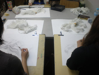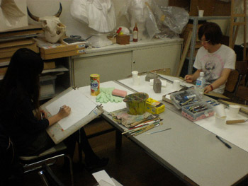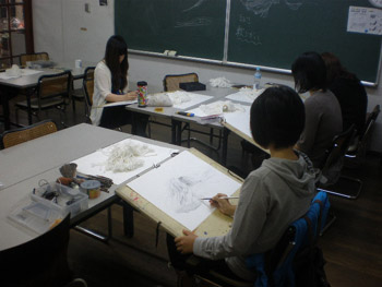 05 October 杉太郎の『今夜も京芸補強』 ♯6 こんばんは!杉太郎の『今夜も京芸補強』、今回で第6回目。熱心なリスナーに支えられて、ここまで来る事が出来ました。これからも、コメント7件目指して頑張り続けます!今日の京芸補強は2日目。描写「モップ」の2枚目の制作に取り組んでいます。 昨日の講評の中で上がった問題点は、「構図」「制作プロセス」、「明暗の階調を増やす」、「前後の空間性」などでした。「モップ」という一つのモチーフを描くのに、本当に沢山の注意点があるのですね!!高校の時に掃除道具として何となく使用していた時は、まさかこんなに複雑な存在だったとは思いもよりませんでした。しかし、普段身近にあるなんて事ない物でも、描くとなったら、全く別の存在に感じる…。それも鉛筆デッサンの一つの面白さですよね。この世にある全てのものがモチーフになり得る。そんな見方で、身の回りのものを観察すると、とても新鮮な世界に感じるのではないでしょうか。そんな事をふと感じました。いやはや、杉太郎、鉛筆デッサンなるものにどっぷりハマッてしまいそうです。 講評風景です。京芸補強では毎回、1枚目の問題点を意識しすぎて、2枚目の方が少しクオリティが下がってしまう作品が何枚か出てきますが、今日の作品は、全ての作品が1枚目よりも良い出来栄えでした。ポイントは、『構図』であったと思います。今日の制作では、モップの持つ「質感」や「空間」が表現しやすいような構図が皆、組めていたと感じます。構図の段階で、表現しやすい置き方や表情をつけてやるのは、これから描く自分に対しての「思いやり」だと思います。「描く前に勝負はついている。」そんな言葉を受験生時代に耳にした事があります。うーん、構図、侮りがたし…。デッサン奥深し…。さてさて、皆さんお待ちかね、杉太郎の『本日の自習風景』のコーナーです。エクセレント!!絵に描いたような勉強風景。平日の夜間17:30~20:00、毎日自習してから帰路につく。とても有意義な時間の使い方だと思います。杉太郎が受験生ならば、この自習室、必ず使用していた事でしょう…。この調子で頑張って下さい!それではまた来週。 <杉太郎製作委員会> [0回] 2010/10/05 (Tue) 22:10 杉太郎関係 Trackback() Comment(3)