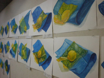 12 October 杉太郎の『今夜も京芸補強』 ♯8 こんばんは!良い子の皆さん、お待たせしました!杉太郎の『今夜も京芸補強』の時間です。「1週間が待ち遠しい」、「毎日更新して欲しい」、「杉太郎のグッズを発売して欲しい」等等、アスクでは今、空前の杉太郎ムーヴメントが巻き起こっています。そんな夢を見ました。そんな事より、京芸補強が始まっています!!制作室に突入です。うーん、今日はやけに教室前の警備が固いですね。おやっ、教室の外で着彩道具を準備している生徒を発見。よし、液体化して生徒の筆洗の中に紛れ込むぞ!ドロドロドロ…。ふうっ、何とか潜入に成功しました。どれどれ… ↑今日は昨日に引き続き、「青色紙、黄色セロファン、檸檬」の2作目の制作に取り組んでいます。構図を改良している生徒、新しい制作プロセスを試みている生徒、水の分量、筆使いに注意を払っている生徒…。昨日のリベンジを果たす為、色々な工夫を凝らし、問題点克服に取り組んでいます。ご武運をを祈ります……! ↑いよいよ講評タイム。ズラリ!と完成作品が並んでいます。上下2列に並べられた作品の内、上の列に貼らている作品は1枚目、下に貼られた作品は2枚目の作品です。本当に難しい課題でした…。昨日の問題点を全て克服できた作品は、残念ながらありませんでしたが、一人一人の作品に、昨日よりも良くなっている部分が確実に見られました。制作時間も短い中、健闘していたと感じます。今回上手く行かなかった生徒さんも、今日の制作の経験が必ず、次回に役立ちます。蛇行運転のように自分の上達スピードが遅く感じる時もあります。ただ、確実に前進している事は忘れないで下さい。「自分が上達する事に、どれだけ自分自身が我慢強く待ってあげられるか」それが上達に一番大切な事だと、杉太郎強く感じます。最後に、杉太郎の『今夜も学科自習』のコーナーです。今夜も黙々と勉強中。ハラショー!!ロシア語で「素晴らしい」の意味です。午後の制作を終えた後も、集中力を持続させるのはとても大変なことです。杉太郎、何か美味しい物でもご馳走してあげたい気分です。頑張って下さい!それではまた来週。 <杉太郎製作委員会> [0回]PR 2010/10/12 (Tue) 22:31 杉太郎関係 Trackback() Comment(5)