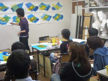 11 October 杉太郎の『今夜も京芸補強』 ♯7 こんばんは!杉太郎の『今夜も京芸補強』の時間がやってまいりました!「身長40cm、体重7キロ」杉太郎のオフィシャルなプロフィールです。国民的人気キャラクター、ピカ○ュウと同じ身長・体重とは、いやはや杉太郎、生まれながらにして、人気者の星の下に生まれきてしまったようです。そんな事より、京芸補強が始まっています。制作室へワープです!(ヴーーーーン)制作室は石膏像の隙間にワープしてきました。おやっ、今週は「着彩」ですね、前回の京芸補強「着彩」ではホウレン草を描いていましたが、今日はどんなモチーフを描いているのでしょうか。どれどれ… 今日のモチーフは「青色紙、黄色セロファン、檸檬」ですね。黄色セロファンが重なった部分の色味の変化を、しっかりと表現できるかが、この課題のポイントのようです。それだけではなく、「セロファンと色紙の質感の描き分け」、「檸檬の凸凹感や量感の表現」、はたまた「画面全体の空間的なまとまりの表現」等…、うーん、後期も既に第7週。後半に入り、京芸補強の課題も一段と実戦的になっています。難しい課題ですが、この課題が克服できたとき、着彩力は今より1ランク上達していると思います! 皆頑張って下さい~! 隣の教室では、推薦対策講座が行われています。あれやこれやで10月もう11日が過ぎました。11月の推薦入試まで約1ヶ月。MASHYUU先生の講評にも熱がこもります。↑夜間の通常授業の風景です。上の二人は中学生の生徒さんです。銅駝高校への受験に向けて、一所懸命制作に取り組んでいます!!青物の着彩は難しいですよね。ファイト~!!最後に杉太郎の『今夜も自習室』のコーナー。今日も三人の生徒が自習室で勉強しています。ファンタズィスティコ!!素晴らしいです。今日は夜の自習室を初めて利用している生徒さんも見受けられます。この調子で頑張って下さいね。それでは今日はこの辺で。また明日。 <杉太郎プロジェクト推進委員会> [0回] 2010/10/11 (Mon) 22:13 杉太郎関係 Trackback() Comment(1)