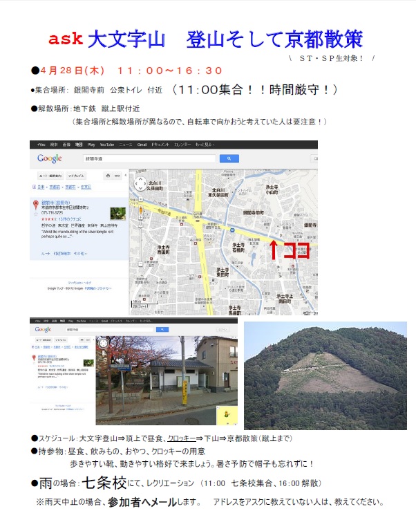 23 April 【予告】大文字登山 4/28(木) 田和です。まず、京芸成績開示請求を未だしていないASK生、講習生は、必ず4/28(木)までに京芸に申請し、結果をASKに報告してください。今年も浪人生を対象に、ゴールデンウィークの時期を狙い、大文字登山を慣行します。今年は、来たる4/28(木)決行です。銀閣寺前に集合。集合場所など詳細は↓で確認。大文字登山昨年度の様子山道を登山し、昼食を食べ、お山でスケッチクロッキーをします。山頂での記念撮影は、毎年1年間を振り返る大事な瞬間でもあります。 ちなみに京芸成績開示請求を未だしていないASK生、講習生は、結果をASKに報告してくださいね。下山後は、イベント後半になります。皆で東山界隈散策します。 最後に京芸成績開示請求を申請し、結果をASKに報告してくださいよ! [0回] 2016/04/23 (Sat) 16:07 アスクでのこと Comment(0)