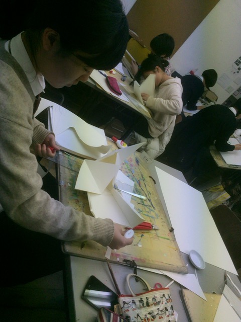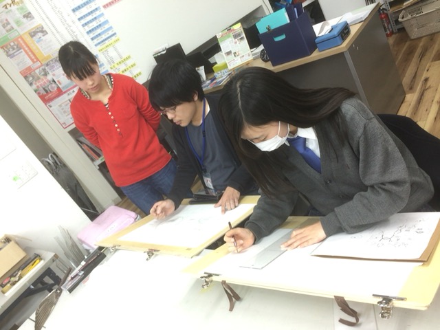 17 December 本日の北大路校 こんばんは。朝と夜だけでなく、昼も寒さをびしびし感じるようになりました。本日は北大路校の様子です。午後授業の様子。立体を制作しているSTSP生を見ながら、制作のスピードの速さを実感しました。課題も残りますが、なんだかたのもしくもあります。夜間授業の様子。夜間授業も、それぞれが自分の課題点を見つけて取り組めていたように思います。この間、久しぶりに大学の恩師と電話で話をしました。元気にしてるかとか、こっちは晴れてるけどそっちはどうかとか、いろいろと話をしてもらってなんだかあたたかい気持ちになりました。皆さんも、生徒間だけでなく講師の先生も含めて、目標に向かって過ごす今の時間を有意義に過ごして欲しいと思います。本当に大事な時間ですね。七条校生徒が描いてくれた先生達の似顔絵です。(真ん中二人は生徒さんです。)皆さんの目にはどんな風に映っているのでしょうか。 和田 [0回] 2015/12/17 (Thu) 21:14 アスクでのこと Comment(0)