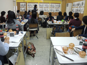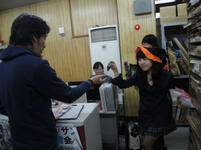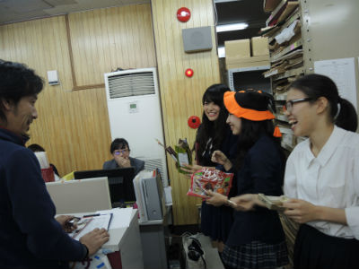 02 November ハロウィンと本日の七条校 こんにちは。先日は、ハロウィンでしたね。七条校でも仮装をしている人がちらほらいました。せっかくなので写真を載せておきます。私もお菓子をもらいました。ありがとうございます。 何もいわずにお菓子をもらおうとするK先生に、ハロウィンの合言葉をせがむ生徒たちです。そして、本日の七条校の様子です。今週のSTSP生の課題は「表情のある自画像」です。今回は、片手を入れることが条件の一つになります。顔だけでなく手を入れるとぐっと画面が豊かになって、作った表情もより映えます。それだけ手にも幅広い表情があるということなのでしょうね。 時々みなさんの制作しているときの顔を眺めたりします。制作に集中しているときの皆さんの表情は、本当にいい顔ですよ。 夜間授業の様子です。今日もいい顔がたくさん見られました。和田 [0回] 2015/11/02 (Mon) 19:22 アスクでのこと Comment(0)