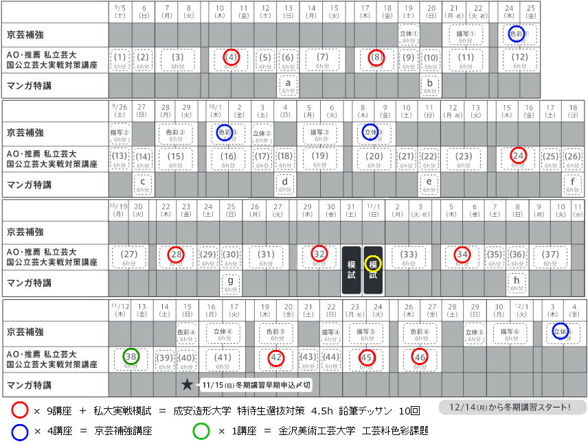 06 October 秋の特講 こんにちは、田和です。本日は既に始まっている秋の公開講座について、教室の様子を交えながらお伝えします。 ■私立芸大の推薦入試対策■国公立芸大の実技対策■京芸に特化した実技対策■マンガ・キャラクターデザインコースに特化した実技対策何れもASK通学生でなくても、受験生ならどなたでも1講座から受講できる公開講座です。京芸補強講座とマンガ特講以外は、個別カリキュラム制です。生徒一人ひとりと面談し、生徒のニーズに合う課題設定をします。 後期になり、実戦対策も始まり、以前より受験生誰しもが忙しそうにしています。受験生でなくとも、この頃は忙しそうに見えるものです。再三言ってることですが、残りの入試期間を漠然と過ごしてしまうのでなく、しっかりと計画性を持ち実技対策に取り組んでみてはいかがですか。■■■通学生A君の志望校と秋の特講受講の組み立て例■■■□第1志望 京都市立芸術大学 工芸科 (国公立前期入試/2月)□第2志望 金沢美術工芸大学 工芸科 (国公立中期入試/3月)□第3志望 成安造形大学 美術領域 (公募推薦入試2期特待生選抜試験/11月)□第4志望 京都精華大学 陶芸コース (公募推薦入試/11月) ポイント※京芸補強は苦手科目の色彩と立体をメインに受講し、11月中旬~下旬の私立芸大2校の推薦対策、特に成安造形大学の特待生選抜試験(4.5時間の鉛筆デッサン)の対策をメインに組立て、京芸対策とは少し毛色の異なる、他の国公立芸大対策も1講座織り交ぜた計画を立てました。合計14講座+私大実戦模試の計画です。※A君は土日通学ですので、通常授業日以外の平日夜間を利用して受講。※月曜~水曜を、学科対策の時間として確保。※逐一、対策の進み具合、進捗を鑑み本人の希望と折衝しながら内容を決定します。秋の特別公開講座申し込みフォームはこちら [0回] 2015/10/06 (Tue) 17:45 アスクでのこと Comment(0)