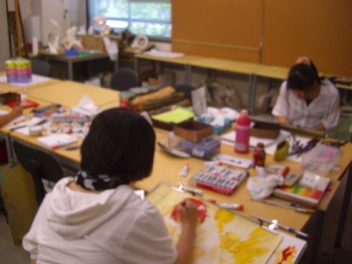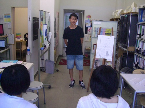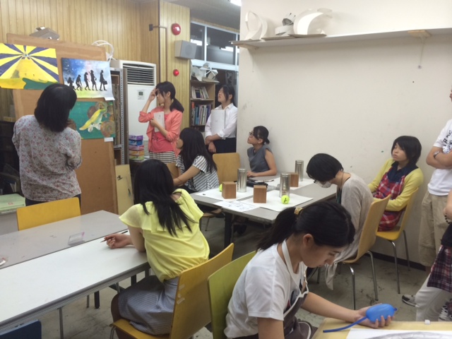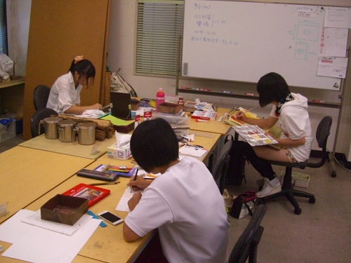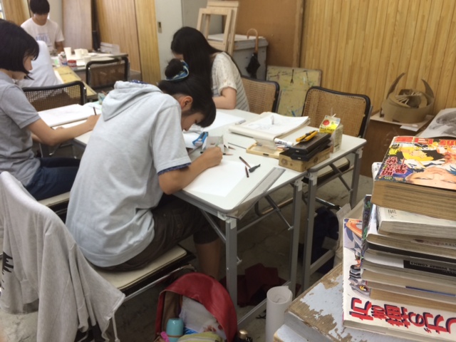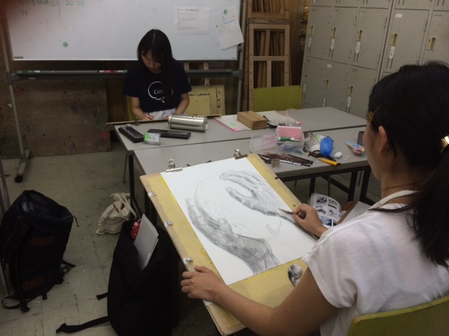 06 August 天気のはなし こんにちは。京芸模試も二日目が終了しました。模試の帰りに七条校に立ち寄った生徒もいましたね。ひとまず元気そうな顔を見て、少しほっとしています。そして本日の七条校。 こんなところで描いている人も。 AO対策の様子。さて、私立芸大のAO入試が始まっています。プレゼンテーションでは自分の主張をしっかりと話すことももちろん大切ですが、他の生徒に埋もれてしまわないように自分をさらけ出すことも大切です。大人になると会話の中で天気の話をすることが増えるのだそうです。当たり障りなく、そこそこに話ができる話題だからです。良い距離感を保たなくてはならない、ご近所同士や仕事先で話すには持って来いの話題というわけです。プレゼンテーションでは反対に、聞いている側からすると相手らしさが見えない発表は薄っぺらく感じてしまいます。誰にでもできるプレゼンテーションではなく、自分にしかできない考えを伝えるということを心がけたいですね。ということで大人なので最後に天気の話をしておきます。連日連夜猛暑が続いています。こまめに水分を補給しましょう。和田 [0回] 2015/08/06 (Thu) 18:15 アスクでのこと Comment(0)