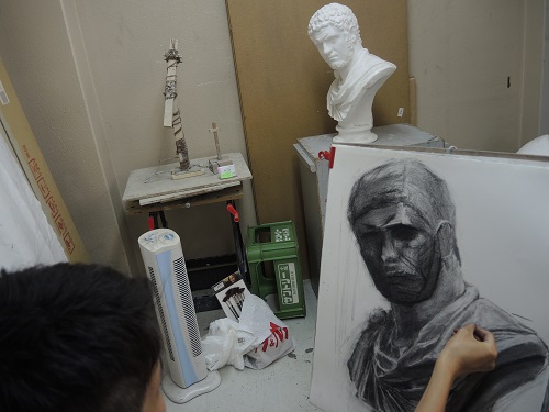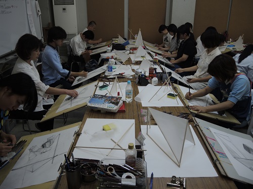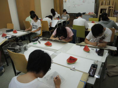 19 July 本日の無料デッサン講座 こんにちは。昨日は台風の影響で、かなり交通網に乱れがありましたが、皆なんとかアスクに通ってくれていました。さて、本日は無料デッサン講座が各校で開催されています。今回のモチーフはスイカです。まさに夏の顔ですね。 スイカは目に飛び込むような鮮やかな赤が印象的ですが、よく見ると果肉が毛細血管のようで、なんだか私はぞわぞわした気持ちになります。ともかく、普段何気なく見過ごしている様々なかたちに気づくこともデッサンでは大切なことですね。七条校無料デッサンの様子 夏期講習・振替授業の様子 本日で日程調整期間も終わり、明日から本格的に夏期講習が始まります。たくさんの生徒がいる中での制作はかなり刺激になると思います。また、上手くいかなくて身動きがとれないように感じることも多いと思いますが、夏期講習中は色んな先生が来てくださいます。たくさん相談してみてください。少しだけ見方が変わることもあるかもしれません。頑張りましょうね。和田 [0回] 2015/07/19 (Sun) 18:31 アスクでのこと Comment(0)