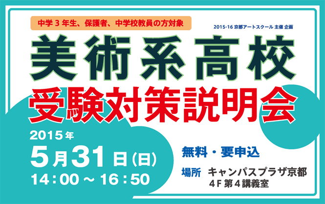 22 May 美術系高校 受験対策説明会 こんにちは。朝晩は冷えますが、日中はかなり汗ばむ陽気になってきましたね。そして紫外線も気になる季節になってきました。さて今年もアスクでは、中学生対象の説明会を行います。 5月31日(日)関西の美術系高校9校をお招きしての説明会を開催します。美術が好きだ。美術系の高校に興味がある。どんな学校があるのか知りたい…などなど少しでも気になる人はぜひ、ご参加ください。美術系高校入試の合格再現作品の展示などもあります!詳しくはこちら→★★話は変わって、本日の七条 STSP生の授業の様子。 坂谷 [0回]PR 2015/05/22 (Fri) 17:06 アスクでのこと Comment(0)