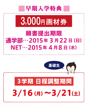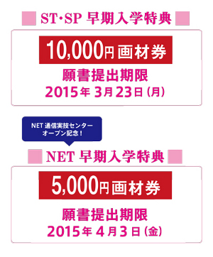 なお、通学部では3/22(日)、NET通信部では4/8(水)までに願書を提出していただいた皆様に、3,000円画材購入券を進呈します。上記特典(ST、SP生入学、NET通信部入学)とも併用可です。