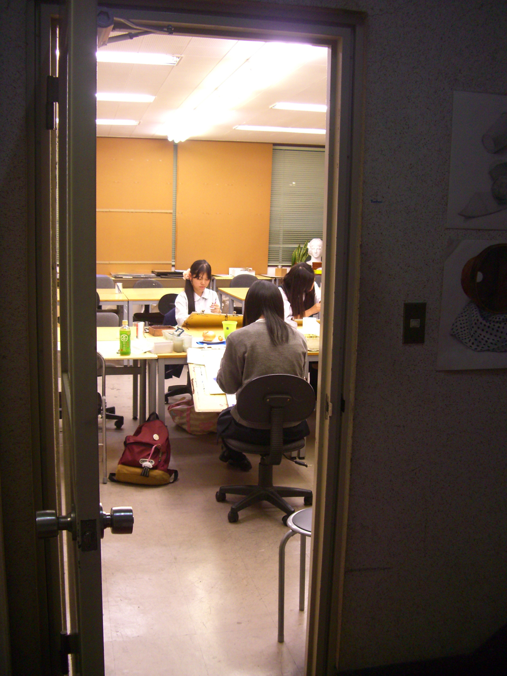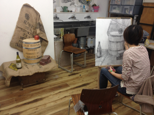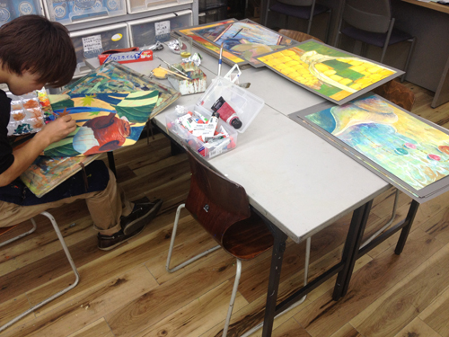 07 October 彦根校の様子 こんばんは。日中は彦根校でNET作品の添削をしていたのですが、寒くてストーブをつけてしまいました。夕方になって、夜間の授業を受ける高3生たちがちょっと早めにやってきました。制作前のひととき。みんな違う高校なのですが、教室からは笑い声がひっきりなしに聞こえてきます。いつの間に仲良くなったんだ?四月からこっち、半年近くも経つのだから当然といえば当然なのでしょうが。普段よく見ている生徒でも、いつの間にか、ということはたびたびあります。そもそも、いつの間にか、な年頃なのだと思います。停滞してたかと思えば、いつの間にかギョッとするほどデッサンが良くなる生徒もいます。 みなさん帰る時ドアを開けて口々「う~寒っ」。いつの間にか秋ぽいなあ。林 [0回] 2014/10/07 (Tue) 17:39 アスクでのこと Comment(2)