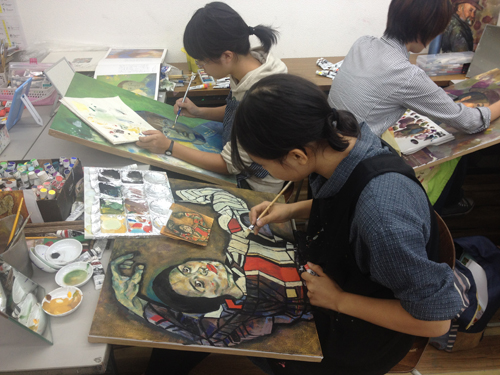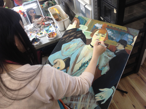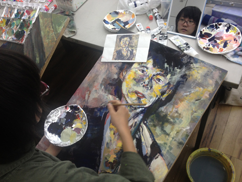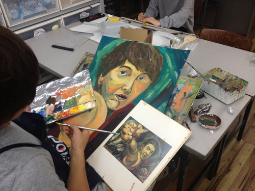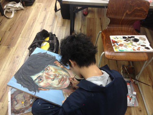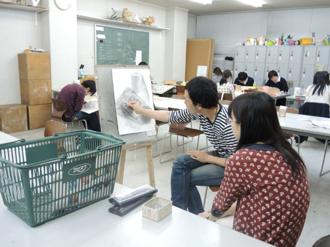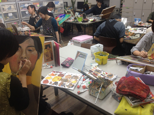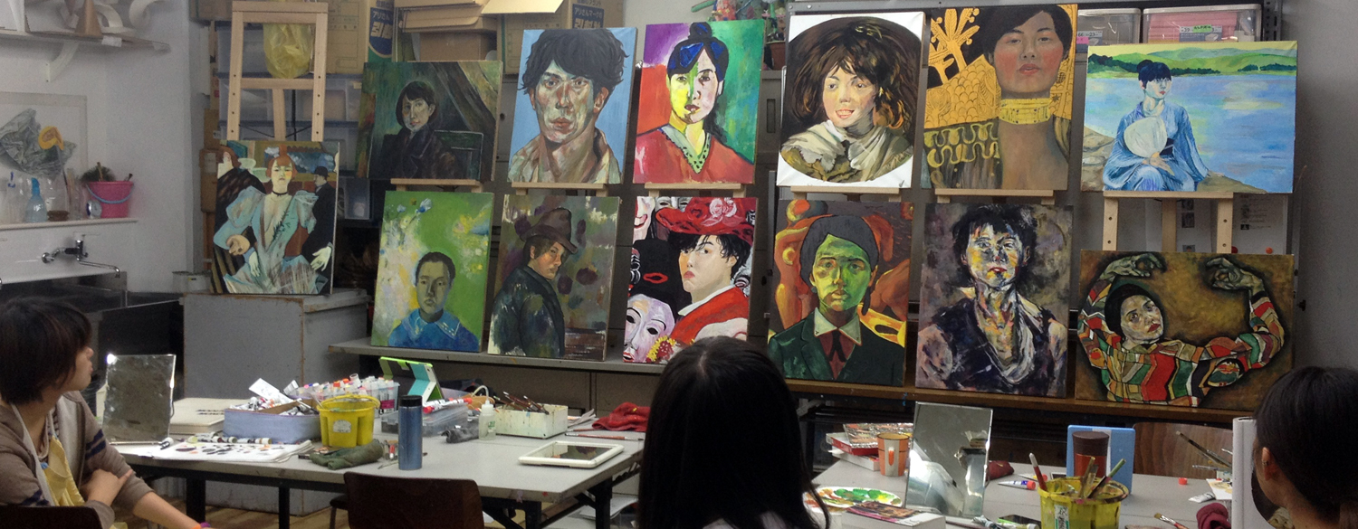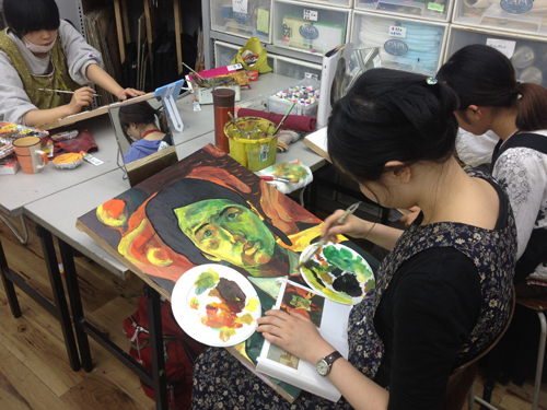10 October アスク授業「作家研究」と「アスクOBの作家」研究 こんばんは、保田です。今夜は北大路校の様子をお伝えします。 今週ST生は「作家研究」という課題でした。1週間かけて、各自が選んだ画家の様式を研究して自画像を制作するというものです。単純に言えば、選んだ作品(人物)の顔の部分を自分にする、ということなのですが…。模写に近い課題ですが、顔の部分を自分にするので、単純に表層を模写するのではなく、その画家だったら、自分の顔をどのように描いたのか?ということを考えながら制作することになり、より、「表現」について考えることが求められるという課題です。 分かりやすい個人様式がある近代絵画の中から選びます。左)保田が持参した画集。ST生は各自画集を持参しましたが、現役生徒は知識が少ないので、準備できない生徒のために準備しました。右)メキシコの画家シケイロスの作品に異様に興奮して飛びついたT君。絵汚してますが、まあいいです、古い画集ですし、役に立てば。(作品はまだ未完成ですが、楽しみです) 結果は、なかなか力作揃いでした。長時間を贅沢に使った制作ですが、じっくり描くことで、学べたことが多かったと思います。ちなみに、この課題を講評する時、少し気をつけていることがあります。意識せず講評すると、自分が好きな画家の絵を取り上げている生徒の作品はすごくほめて、嫌いな画家の作品だと、酷評してしまいやすいのです。どうしても、元絵に近い仕上がりになるのだから、好きな絵は見ているだけで楽しく、好きなものは好きなので、危ないのですが、今回は気を付けていたので大丈夫だったと思う。通常授業で、時間をたっぷり使った課題が多い分、夜間の特講は、実戦対策を行っています。 京芸補強(立体) ※この問題は30年以上昔の過去問題です。 国公立・私立対策 ※武蔵美 版画対策(渋い表情の片岡先生)現役生の様子高3生 今週は、テスト週間前なので、教室には余裕がありますが、今日はたった1人。 基礎 保田(季節の変わり目で、いつも通り体調が芳しくない)ところで、「作家研究」といえば…アスクOB生でも、既に作家として活動している人もたくさんいます。 ⇒たとえば(アスクはまだ出来てから20年なので、OBはまだ若いのですが…)展覧会のハガキなどたくさんもらっており、なるべく、行こうと思っています。先週は、アスクOBでもある、非常勤講師の髙木先生、元講師の久門君の展覧会に行きました。髙木先生は、生徒時代から、描・色・立ともトップレベルの、まれにみる優等生でしたが、京芸入学後も順調に成長されているように思います。今回もすばらしかったです。いやホントに毎回良くなっていっている。空恐ろしい。 タイトルは「たぬき」???と思ったが、どうも信楽焼きのタヌキのようです。まだやっているので、大阪方面の生徒はぜひ見に行ってほしいです。(やはり、写真では魅力が伝わらないので)YODギャラリー久門 剛史氏は(まだ学生の髙木先生とは違い、既に作家であるので氏としています)2000年にアスクST生、京芸在学中~卒業後までかなり長く非常勤講師をしてもらっていた方ですが、活動の場を東京に移すということで、アスクは辞めて、東京で作家活動を続けていたようですが、その後のことはあまり知りませんが、最近京都に戻ってこられたとの噂です。成安造形大学の「キャンパスが美術館」の企画展「私の神さま | あなたの神さま」展の招待作家として展示されていました。昨日、大津方面の高校訪問の隙間に見に行きました。 サウンドが大きな意味を持つインスタレーションなので、写真では、ほとんど何も伝わらないのですが、一応紹介しておきます。会場に設置された様々なオブジェクトが、時々、光ったり、音を立てて動きます。それぞれ、関係しているようなしていないような…。 総合領域の授業として、展覧会を見学している場に遭遇 「私の神さま | あなたの神さま」の別の展示(「私の神さま | あなたの神さま」展は、成安造形大学の中のたくさんの展示スペースがあり、「三井寺」等、外部のいくつかの会場での展覧会で、招待作家と学生の作品が含まれる)まだやっているので、大津方面の生徒はぜひ見に行ってほしいです。「私の神さま | あなたの神さま」(京都市内の会場もあります) 案内してくれた入試課の吉田周平さん、と、偶然出会ったアスクOB(元NET生)のNさん。Nさんは4回生(あっという間ですね)。既に、京都市内の広告代理店に就職が決まったとのこと。吉田さんは入試課の人ですが、成安OBで作家活動もがんばっておられます。面白い作品をつくられています。(吉田さんの展覧会は何度も行っておりますが作品すごく面白いです⇒)※4つ目の記事Nさんは金沢の高校出身のNET生でしたが、たまたま同じく金沢出身の吉田さんの高校の後輩で、そんな縁もあり、成安造形大学の学祭等いろんなイベントを手伝ったりして仲良くしてもらってたそうですが、そういった経験も