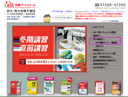 12 January 1/13(月)~ NET基礎 3学期スタート! こんにちは。 サイトウです。 明日、1/13(月)からはNET通信実技講座 基礎3学期がスタートします。 岐阜や福島、滋賀、沖縄など出身地さまざまなメンバーでスタートです^^ 国公立受験のNET生のみなさんは、1/13(月)が今年度最後の提出日で、 続々作品が教室に到着しているようです。 基礎生の皆さんには、先日、モチーフや用紙を発送しましたが、無事届いていますでしょうか? そして課題サイトの見方やパスワードに関してのメールはチェックしてくれていますでしょうか? (メールを見たら、「確認しました 名前(フルネーム)」で担当講師に連絡くださいね) 今日は、課題サイトの見方と、おすすめページの紹介。 課題サイトはここからですよ! (スマホだと若干画面が違いますが、課題サイトへの入口はあります) 課題サイトはもちろん見てほしいのですが、 今日おすすめしたいのは、「資料室」。 美術部の人とか、地元の画塾に通っていて、 なおかつaskのNET講座に申し込んでくれている人はいいのですが、 実技の経験がないという人は、最初が大変だと思います。 そんな人のために簡易ではありますが、制作の目安になる資料が掲載されています。 自分で動画や画像を調べたりしつつ試行錯誤、 「なんでそうしたほうがいいの?」「なんで」「なんで」を繰り返して、制作してみてください。 そして、春期講習(無料)に来てください。 悩んで考えた分、直接指導で教えられたことが、すっと腑に落ちると思います。 askのNET講座は、自宅で制作できる課題と、無料スクーリングや講習参加がセットになっています。 自分で想像するだけではなかなか上達はしない反面、 自分で想像し試すからこそ、鍛えられ、成長できます。 毎年ですが、NET生は少し、通学生より大人びて感じることがあります。 スケジュールを自己管理し、発送の手配をし、 質問があれば、講師にメールで文章を打ったり、電話を自分でかけたりする。 その一連の作業がひとつひとつその人の品格をあげていくんだと思います。 (もちろん、人によりますし、通学生にもしっかりした人がいますけども) まずは、メールの書き方からちゃんとしてみよう!と取り組んでもらえるとうれしいです。 そして、最初の提出日は2/10(月)。 がんばる人は、1つの課題を2枚描いて、うまくいったほうを提出し、 もう一方を画像で講師にメールしてくれたりします。 同じ値段でも、絶対成長率違うよな……と感心します。 2/8(土)には発送できるようにしましょう! <サイトウ> [0回] 2014/01/12 (Sun) 14:27 アスクでのこと Comment(0)