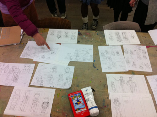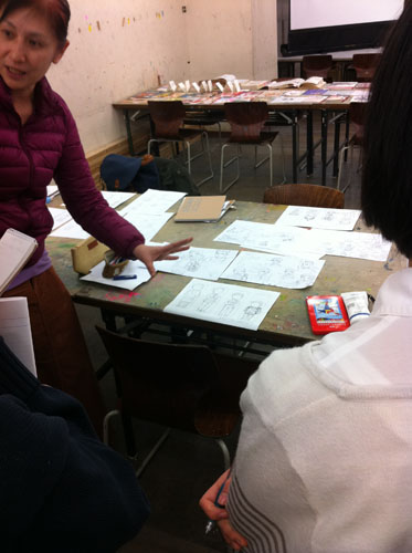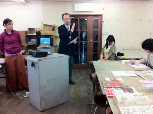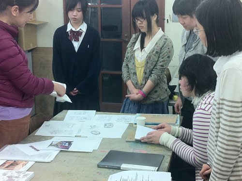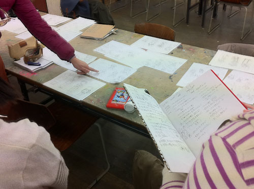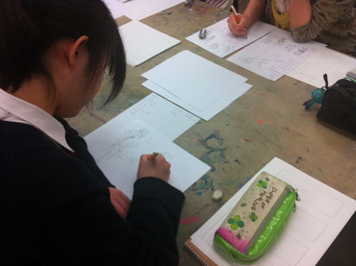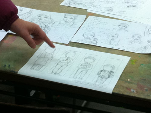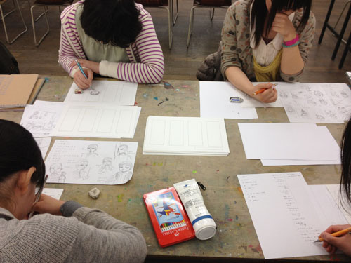 30 March 成安造形大学 イラストMON先生ワークショップ こんにちは 保田です。本日は北山校から、春期授業の報告です。3月28日(水)成安造形大学から、イラストレーション領域准教授のMON先生と入試課の橋詰さんに来ていただきました。今回の課題は、実際に成安造形大学のイラスト授業の中で行われている授業を少しだけ簡略化された内容で、9種類の職業のキャラクターを描きわける、というものでした。(魚屋さん、漁師、高校の古文の先生、塾通いの奨学生、東大生…など)さて、まずは、プロジェクタを使った導入なのですが…大学の紹介~先生のイラストの紹介~そして課題説明という流れなのですが、先生の仕事の話がそのまま課題説明に重なっていました。例えば、○○という雑誌で連載されたシリーズ広告のキャラクター設定が、どんな依頼からスタートして、どのようなアイデアからラフスケッチを起こしたのか、その時注意したことは何か、最初のチェックでどんな修正依頼が来たのか?等々、クライアント(依頼者)や編集者とのやり取りのリアルな話が聞け、そこでちゃんと話を聞いていれば、制作のヒントがたくさんある、という形でした。さすがプロということなのでしょうか、イラストの仕事といっても、様々な先から思いもよらないぐらいのバリエーションの仕事を請けておられ、それぞれの仕事ごとの苦労話は非常に興味深かったです。それらの中で、一つだけ紹介しておくと…NYのビル屋上の貯水タンクを紹介するイラストと、それを描くための資料や、クライアントとのやりとり、スケッチなど、一つのイラストが出来上がるまでの苦労が少しだけわかりました。(NYの貯水槽が今でもほとんどが木製で、19世紀依頼、ずっとアイルランド人の樽職人が同じ技法で作り続けている(それには合理性がある)という話も興味深かったです。)そういった実際の経験から、次代のイラストレーターを目指す若者達への生きたアドバイスが生まれるということなんですね。真っ暗い教室の中でも、眠くなることなく、みんな集中して話を聞いていました。先生の実物のスケッチを見せながらの導入があり、制作が始まりました。今回参加してくれた受講者は、実技の初心者が多かったのですが、イラストやマンガ系の志望者ということで、それぞれ自分なりにキャラクターやイラストを描いてきた生徒が多く、短時間の中でよく描けていた… と保田は思っていましたが、先生は甘くはなかった(笑)。頭身の比率設定の狂いなど、優しくではあるが、指摘は厳しかったです。しかし、それにへこたれることなく、生徒達は授業終了後も質問したり、持参作品の批評を求めたり、だいぶん先生を足止めしてしまうことになった…。 MON先生ありがとうございました。最後に、たくさん持ってきてもらった成安造形大学イラスト領域の現役生徒やOBの作品を見る時間もあったのですが…写真の真ん中のマンガ作品は、約10年ほど前にアスクから成安に進学した高橋君の卒制作品。彼は、07年の卒業後、マンガ家としてデビューを果たし、現在は東京で活動しているとのこと。高橋君は、七条教室(現七条校)が出来た当時、福知山から毎週通ってくれていた、やや気弱な少年で、よく憶えてるのですが、しかし、びっくりしました。まさかもう既にプロになっていたとは。(だったら連絡してこいよ!) …みんなも、続いてほしいものです。保田ところで…成安イラスト領域からは、イラストレーターはもちろん、マンガ家もたくさんデビューしているとのことでしたが、その鍵となっているのは、やはり画力(MON先生曰く)とのことでした。とにかく画力を徹底して鍛えるとのこと。その点はアスクとまったく同じ考え方だなと思いました。みんな春期講習もがんばろう。 [0回] 2013/03/30 (Sat) 18:58 アスクでのこと Comment(3)