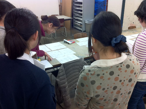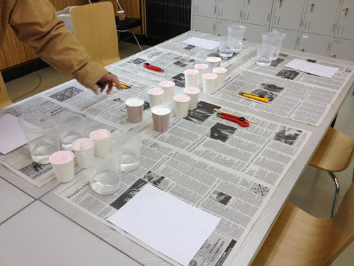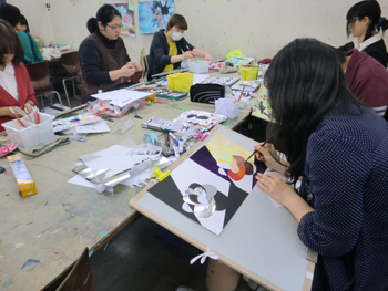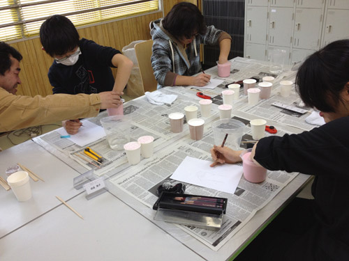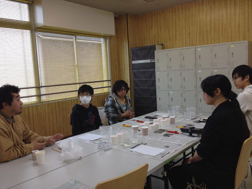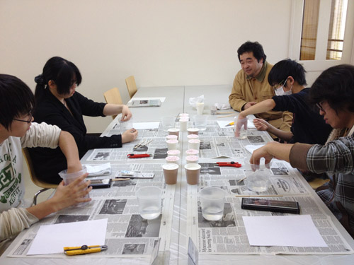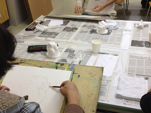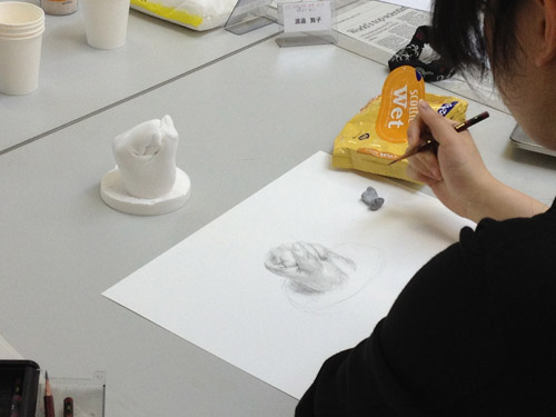 03 April 『イメージ』の重要性 大阪成蹊大学芸術学部 岩野先生ワークショップ こんばんは、保田です ↓本日は4月2日(火)七条校で行われた、大阪成蹊大学芸術学部 岩野勝人先生によるワークショップの報告をします。岩野先生は保田の大学時代の2つ上の先輩で、大学時代にもいろいろお世話になり、(保田は油画科、岩野さんは彫刻科だったのですが、芸術大学ではそのへんは混ぜこぜです)現在も、大阪成蹊大学芸術学部の先生として、アスクの様々なイベントに参加してもらったり、とやっぱりお世話になっている、という方です。今回は、七条校でワークショップを行ってもらいました。石膏で手をつくるのですが、塑像や彫塑して造るのではなく、コピックという海草から抽出された液体と石膏を使って「手そのものを石膏どりする」というものでした。え、それってただコピーするだけで、何かをクリエイトする訳じゃないし、クリエイティブな行為ではないのでは…? と思うでしょ。それが違うんですね。コビック、石膏、水、道具(割り箸、つまようじ)… 準備が大切。まずは、どんな手をつくるか、イメージを練ってもらう。(スケッチたくさんします)次は作業。コビック(粉)と水をかき混ぜ、容器に手を入れてしばらく固定します。この時、手は浮かしたままなので、けっこう辛いです。そして、この待ち時間の間にも、残された手で中の手をイメージしてスケッチします。これもけっこう辛いし、見えないものを想像して=イメージして描くのは難しい。コビックが固まったら、そうっと手を抜いて、そこに、水に溶いた石膏を流し込みます。この時、石膏を指先までしっかり流し込めるのか?が課題です。先ほどのスケッチの時に、しっかり手の形がイメージできていたのかが問われてきます。手の形がしっかりイメージ出来てないと、指の先までの石膏の流し込みができないんですね。石膏が指先の穴まで届いてないと、もちろん指の先の欠けた手になってしまう。あのスケッチにはそんな目的があったんですね。後は作業です。作業ももちろん大切です。そして、完成した作品をさらにデッサンしました。さて、ワークショップの中では、素材を使った具体的な作業、道具の制作、手のポーズをしながらのスケッチ、見えない手をイメージしてのスケッチ、容器の中で固まりつつある「手」をイメージしてのスケッチ、完成作品を観てのデッサンなど、様々なことを体験しましたが、メインテーマは「イメージする」ことの重要性、ということでした。ところで、芸術大学にはいろんな学科やコースがあって、必ずしも絵を描くばかりじゃないのに、入試では必ずといっていいほどデッサンが出題される。観たものを正確に描く、ということがそんなに大切なのか?という疑問を持つ人がいてもおかしくないと思うのですが。今回のワークショップの中でわかったことは、・物をつくる前に、頭の中で「イメージする」という行為は、ものつくりに不可欠な行為・そしてそれは紙と鉛筆をつかってスケッチすることで、やりやすくなる ということだと思います。だからこそのデッサンなんだと思います。デッサン力を鍛えて何でもすっと描けるようになっておかないと…。その点では、彫刻も、油絵も工芸もデザインもまったく共通です。だから、どこの芸術大学でも、彫刻科も油絵科も版画科も漆科も染織科もビジュアルデザイン科も環境デザイン科も…(以下略)、入試ではデッサンを描くし、大学では入り乱れて遊んだり、交流したりするんですね。そういう訳で、大学時代は岩野先輩にお世話になる機会もあったという訳か…。なるほど。実は、前回ブログで紹介した成安造形のイラスト領域のMON先生も同じようなことをおっしゃっていました。「受験の時のデッサンやクロッキーと大学の制作を別のことと思ってしまっている生徒がいる。例えばキャラクターが自転車に乗っている時の脚の形、歩いている時の脚の形、がすっと描けるようになるためにこそ、デッサンやクロッキーが必要なのに、絵が上手くなることが自己目的化してる生徒がいる。それは間違いだ、ということです。その点は、保田もアスクでデッサン指導をする中で、常々誤解のないよう伝えたいと思っていたことではありますが、十分伝えられていなかった点かもしれません。まあ、受験時代ぐらいは、目的がわからなくなるぐらいデッサンに夢中になるのも悪くないとは思うのですが、デッサン自体は目的ではないんですね。(リアリズムの画家を目指す人は別ですよ)目的ではないけど、とにかく大切なことでもあります。岩野先生ありがとうございました。保田ちなみに、岩野先生は、昨年からアスク彦根校の教室長としてがんばってくれている松野先生の恩師でもあります!「松野をよろしくお願いします」と言って帰られました。アスクは生徒だけではなく、先生が成長する場なんです。僕もがんばらないと、と思いました。 [0回]PR 2013/04/