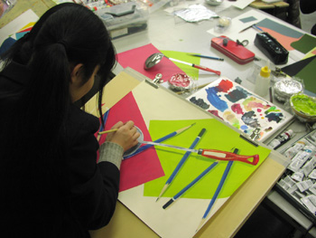 19 January 色彩で思うこと/震災のこと さて、北山教室、今日は色彩構成。 サイトウです。 先日まで、ひーひー言いながら年間パンフレットを作成していました。 色彩構成で指導する「構成力」や「色彩力」は、 あたりまえのようにデザイン作業にも関わってきます。 パンフレットなんかを作っていると、写真・文字・作品写真…など さまざまな要素がからみあいます。 なおかつ「コンセプト」と呼ばれる紙面の意味的な目的も問われる。 要素を画面に放り込んだあとは、 画面全体を目を細めて眺める作業を行います。 (色彩制作でも「画面全体を見渡そう」って言ってるのと同じ作業です) そして、 「なんかまとまりが弱いな」「ここ目立たせたい内容なのに、目立ってない」 「なんかこの色どぎついな」などなど問題点を把握します。 次は、 「まとまりが弱いのは色相を何種類も使い過ぎているからだ」 「目立たせたいところじゃないところの明度差が強くなりすぎているな」 と見当をつけて、改善案を試していきます。 で、改善案の検討が自分じゃつかないとき、他人に相談してみる。 今やってる色彩課題が、仕事につながりそうな気がしてきましたか? 専門家ではない人は、明度や色相や彩度で視界をとらえる意識や訓練ができていません。 「大きさ」や「意味」のみにとらわれがちです。 しんどい思いをして、得られる能力はある分野だと思います。 大学行ったら(私はデザイン科でした)「文字の種類」や「ページ構成」など、 具体的なデザインに関わることをさらに学びます。 もちろん、私なんてまだまだペーペーペーペーパーパーですが…… お母さんお父さん大学へ行かせてくれてありがとう。と最近思う。 でも実際、アスクで働いて学んだことが大きい気もする… みんな、今は自分の能力を創っている時期です。 しんどいこともあるけど、ふんばってコツコツがんばってほしいです。 先日、ウエダさんのが震災のこと、ブログでも書かれていました。 昨日、京芸へ行き、昨年度アスク生の濱口さんが関わる、 震災ドキュメンタリー映画を観てきました。 20歳の岩手県陸前高田市出身の女の子が被災地の現状を記録し、 多くの人に声を届けようと身近な人へインタビューなどをしている内容です。 以前、ニュースにもなったようです。 風化しないようにこうやって、 活動をしてくれている人のアクションにはこたえたいなと思います。 濱口さんや、あちらで遭遇できた京芸生も含めて元気でした!! スマイルなっちゃん <サイトウ> [0回] 2012/01/19 (Thu) 17:53 アスクでのこと Trackback() Comment(0)