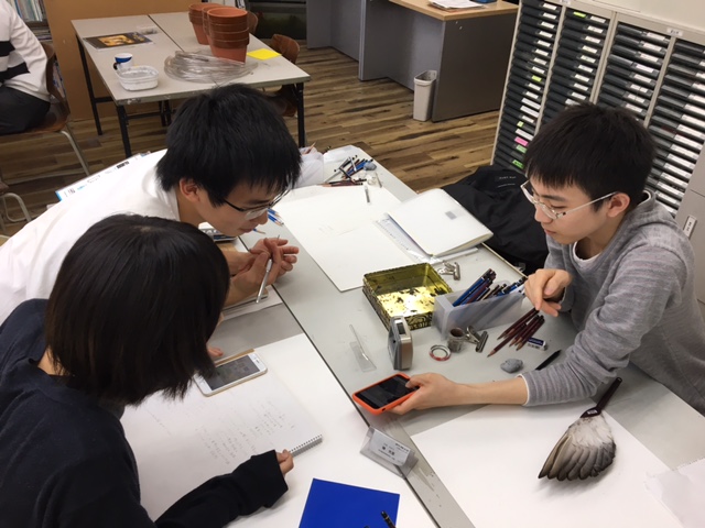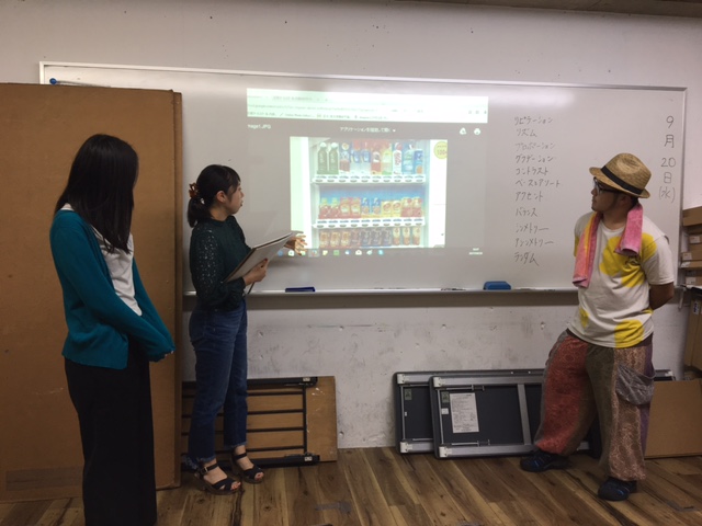 20 September 眼の冒険 こんばんは。北大路校より実技講師の上杉です。日常で目にするさまざまなモノは、意味に塗り固められています。ただ、一旦意味のフィルターを外すと、そこには形と色に溢れた世界が広がっています。北大路校の造形トレーニングでは、「眼の冒険」と題し、日常に溢れる様々な形について、考える授業を行いました。教室で構成原理を事例で簡単に学んだ後、教室の外へ出て、いざ「眼の冒険」へ。美しいと感じた風景をスマホで撮影し、教室に帰ってグループに分かれて、話し合い。撮影した写真から、様々な構成原理を見出し、最終的にどのような心理作用があるのかを、考察し、発表しました。・リピテーション・リズム・プロポーション・グラデーション・コントラスト・ベースとアソート・アクセント・バランス・シンメトリー・アシンメトリー・ランダムこじつけでよい事。間違っていても構わない事が条件です。大事な事は、各自の考えで、形について理解を深めていく事です。 このグループは、一見何となく配置されている植木鉢に「リピテーション」・「リズム」・「アクセント」・「コントラスト」など、さまざまな構成原理を見出し、魅力を語ってくれました。一番左端の「背は低く、密度の高い植木」と、一番右端の「背が高く、密度が低い植木」との関係は「バランス」ではないかと、話してくれたA君の意見は、とても面白かったです。日常の様々なモノから着想を得ていく事。心を弾ませ、日々の制作を行っていく事に繋げてもられたらと思います。上杉 [0回] 2017/09/20 (Wed) 18:22 アスクでのこと Comment(0)