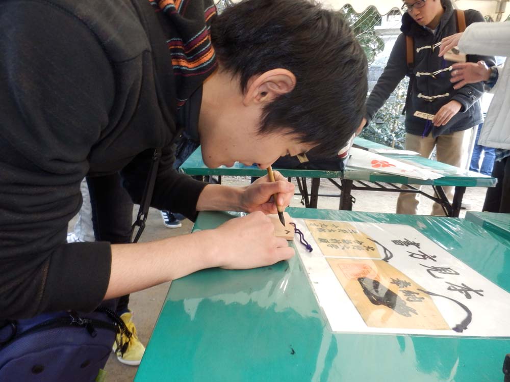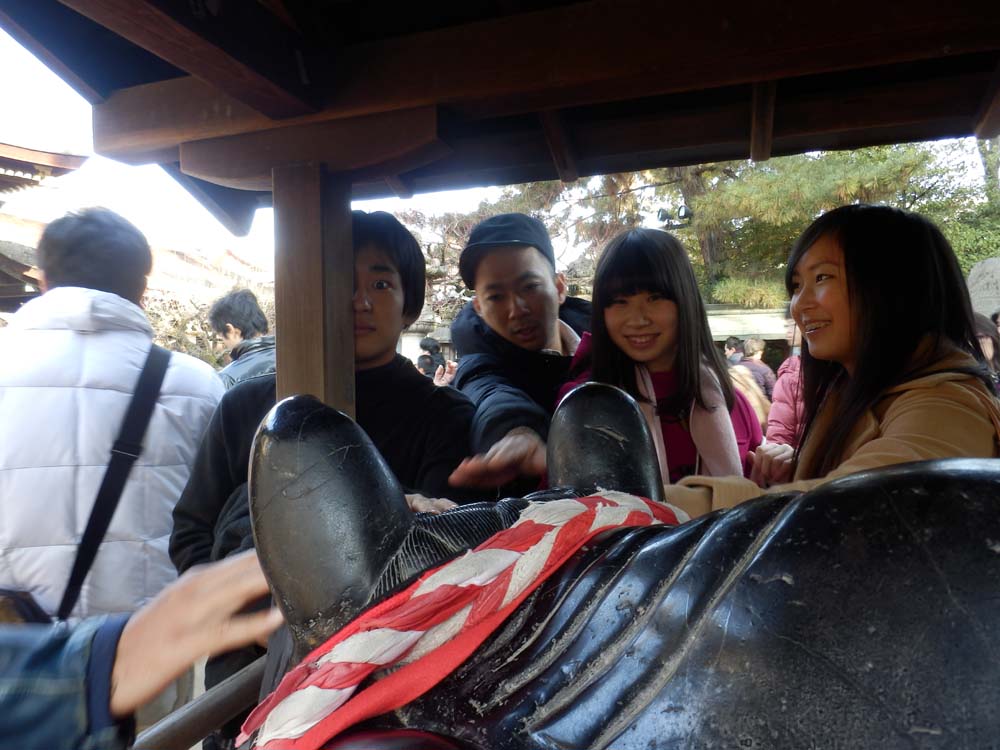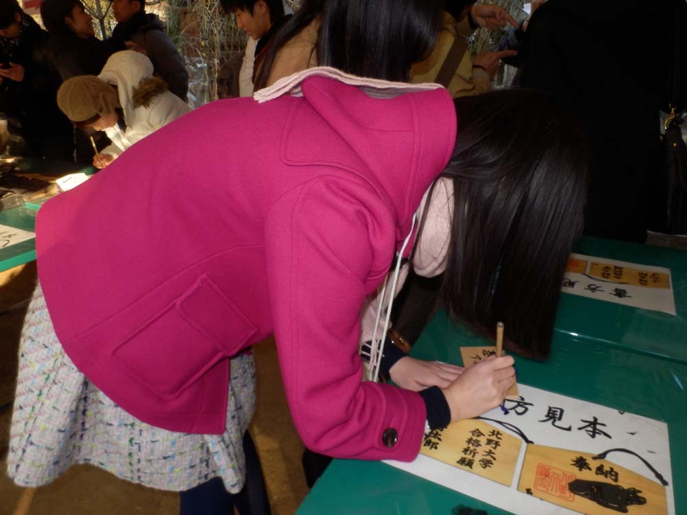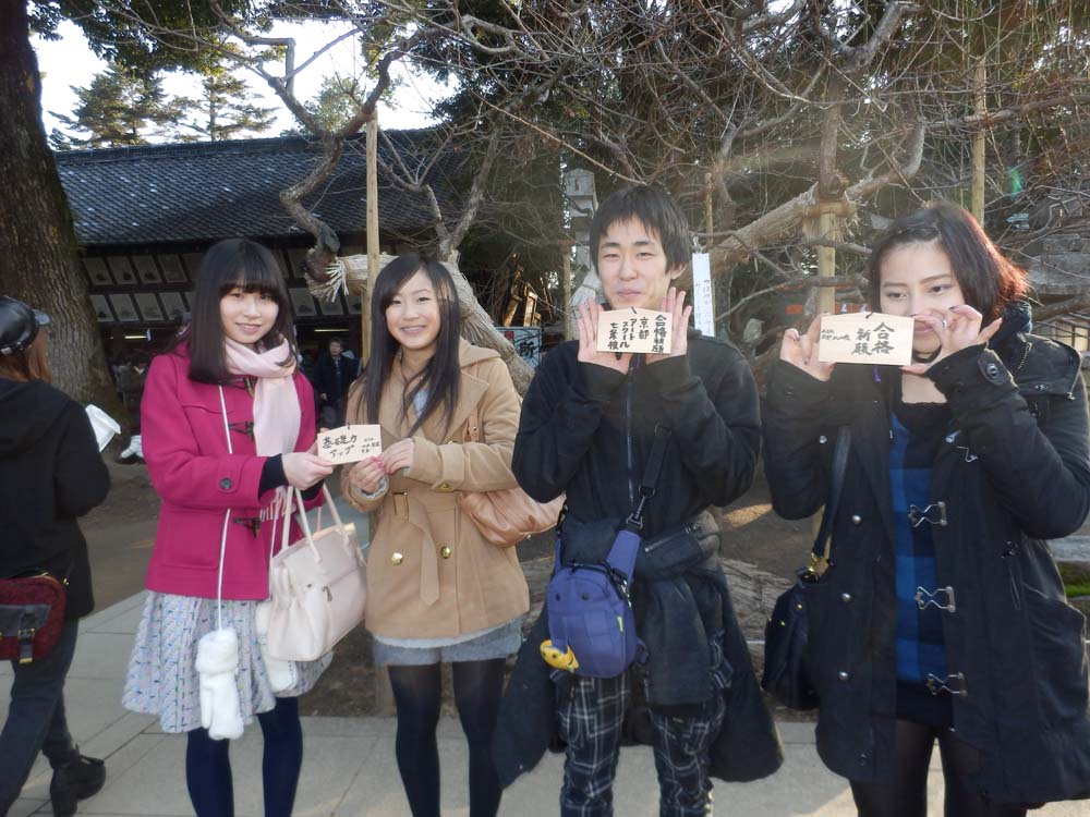 05 January 北山校七条校 初詣!! 新年明けましておめでとうございます。って、もう明けて久しいですが、皆様いかがお過ごしでしょうか。僕は休み中の不摂生がたたって、顔に爆弾みたいな吹き出物ができました。さて、彦根校の初詣の様子に引き続き、北山校、七条校の初詣の様子をご報告します。今年は北山校の基礎生も参加してくれましたよ。菅原道真公がまつられ、学業成就や武芸上達がかつてよりお祈りされてきた北野天満宮に御参りしました。去年、一昨年と僕は参加しましたが、両日とも物凄い寒波と鉢合わせて、吹雪くわ冷えるわで荒れた天候でした。しかし今年は晴れました。気温も幾分おだやかで、初詣日和でしたね。なので、北野天満宮は人人人の波、なかなか社殿にまで辿り着けませんでした。 人ごみをかきわけ牛を愛でたりしながら やっとこさ、門で記念撮影。 無事参拝を終えて、おみくじ引いたり 絵馬に合格祈願したり。基礎生は基礎力アップ祈願。みんな字が上手いなあ。中でも北山校を代表して書いてくれたTさん。物凄く字が上手い。きけば書道六段(ジュニア)だそうで。かっこいい。僕なんかは希代の悪筆なので、絵馬でも書こうものなら道真公に「顔洗ってスキンケアして出直してきな」なんて冷たくあしらわれそうです。 この絵馬なら大丈夫。 で、奉納。何卒お願いしますよ天神さま。帰りは甘酒を飲んで、屋台の軽食を楽しみました。 やけくそに盛られたヤキソバ。重食。正月気分の盛り上がる、なかなかに楽しい初詣でした。さあこれからが正念場。良い年でありますように。はやし [0回]PR 2014/01/05 (Sun) 18:11 アスクでのこと Comment(0)