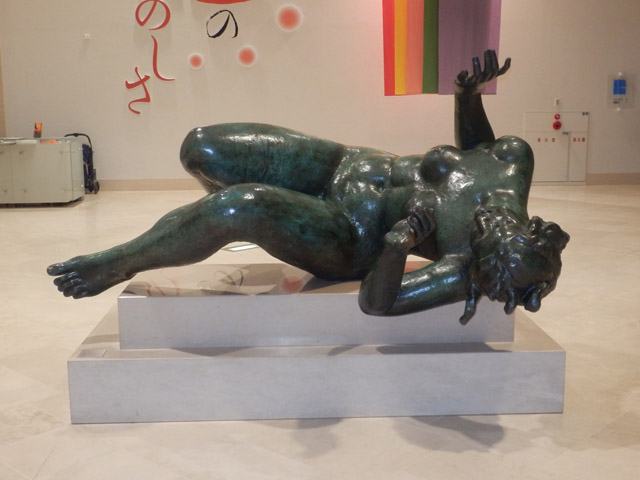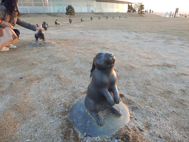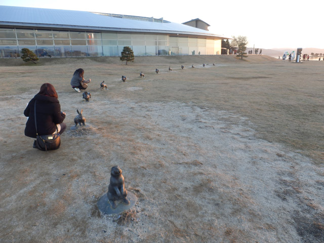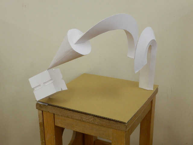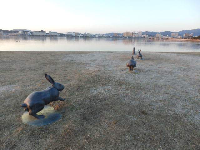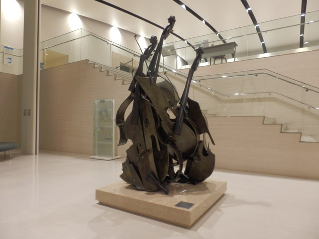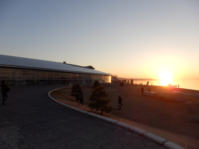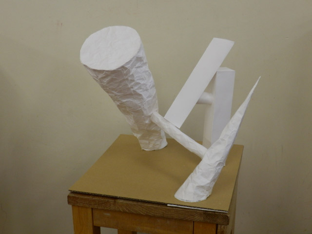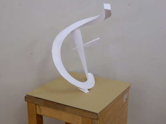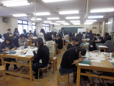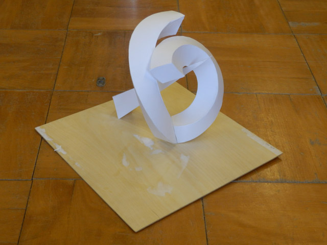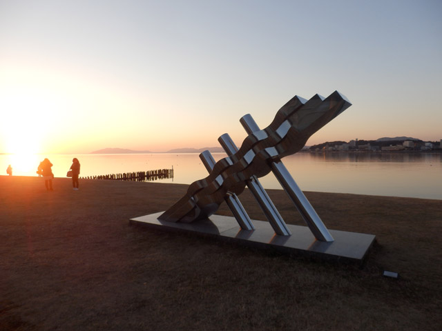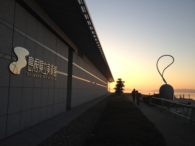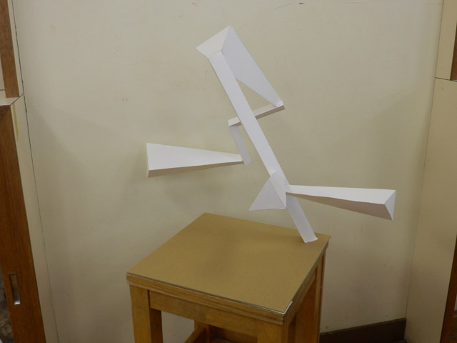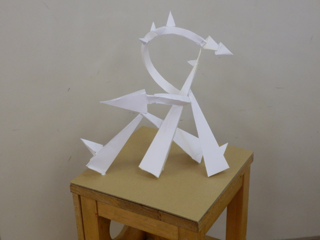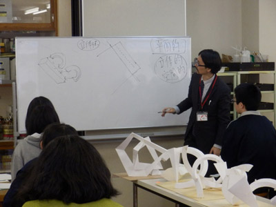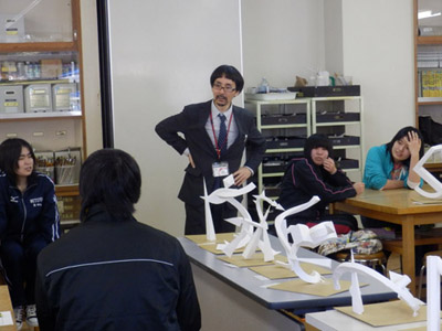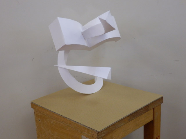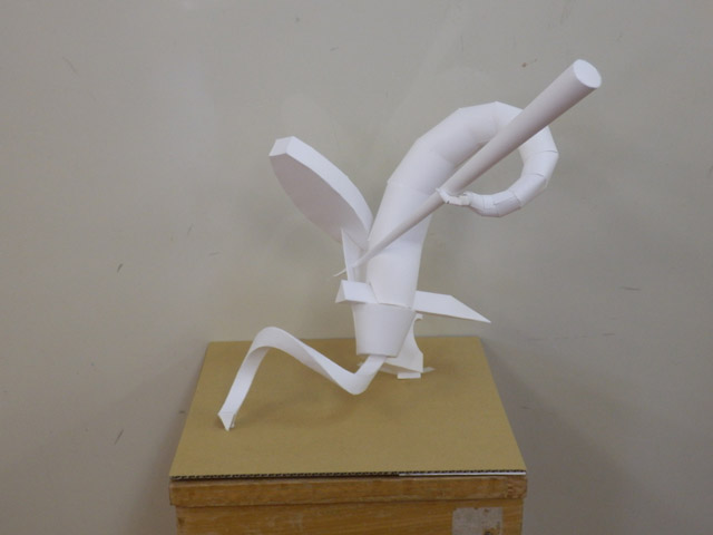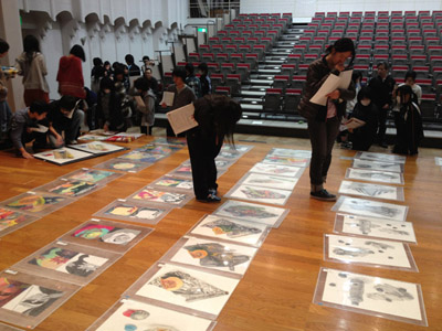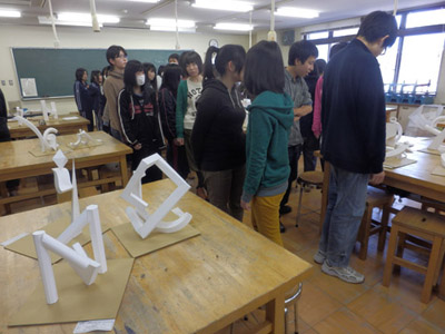 05 February 松江・出雲 彫刻講習会 こんばんは保田です。1月28日~31日にかけて島根県に行ってきました。出雲市にあるサンレイク出雲で開催された島根県の高校美術部の実技合宿(彫刻講習会)に講師として呼んでもらいました。保田は2011年に続いて2回目の参加です。28日・29日は松江地区、30日・31日は出雲地区の彫刻講習会ということで、島根県の3つの地区のうち、連続して開催された2つの地区講習会に参加しました。前日夕刻、松江入りし、まずは島根県立美術館に行きました。 ここは3回目ですが、素晴らしい美術館です。毎回企画展も面白いし、常設展はかなり充実しています。しかし、なんといっても最高なのが宍道湖畔のロケーションと設計。宍道湖畔に開かれた広々としたオープンスペースの屋外彫刻は湖と空が背景となってすごく見栄えが良いのですが(京都にある屋外彫刻の大半は背景がゴチャゴチャして見づらい)夕暮時など、その「背景」の方がさらに魅力的だったりします。今回も閉館前1時間の訪問でしたが、多くの人が日暮れを見ていました。 中:建畠 覚造、右:渡辺豊重 (ちなみに建畠 覚造氏は京芸学長建畠 晢先生のお父様です) 籔内佐斗司《宍道湖うさぎ》しかし、もちろん美術館に来た目的は「彫刻講習会」の導入授業のための資料作成です。「立体構成」とは何か?を説明するための資料として立体作品の撮影に来ているのです。あくまで仕事、仕事で来てます。宍道湖観光ではありません。(言い訳のようですが...)しかしこんな美しい夕日は前回ここに来た時以来じゃないかな。思わず合掌してしまいました。 屋外の作品を一通り撮影した後、館内のブールデル、マイヨール、アルマンの作品を撮影。全ての角度から魅力的に見えることを説明するため、それぞれ四方八方から撮影しました。有料会場にあるロダンは撮影禁止なので無理でしたが...。しかし、屋外の作品群はもちろん、館内のブールデル、マイヨールが常に無料で見れるというのは素晴らしいですね。常設展示会場のロダンもたった300円ですし。僕は特にブールデルが大好きなのですが、マイヨールも最高にいいですね。それと、美術館全体の(ロケーションをふまえた)環境設計や空間構成も勉強になります。さて、当日ですが、松江地区、出雲地区ともに約70人の生徒が参加。前日撮影の美術館彫刻群の紹介も含め、1時間程度の導入の後、まずは、グループ予備制作。(2時間半)4、5人ずつのチームに分かれ、三角柱スパイラルと四角柱スパイラル、三角錐を作成して、構成。台板に接着する際、3点、あるいは1点と1線(直線)、1線(曲線)、1面のみによる接着、が条件。ここでは、三次元曲面を持つ立体の構成法、独立のりしろ、等指導し、作図~カット~折込~接着などを体験してもらい、複数のパーツによる構成の際の最終段階の重要性を認識してもらいました。 右作品:予備制作の優秀作例 予備制作の講評~本制作「イニシャルによる立体/空間構成」の導入。本制作は6時間。課題は、各自の名前のイニシャル文字(ローマ字)をケント紙で立体化(閉鎖立体)して構成。初心者含む高1・2生に短時間で、創意工夫しながら完成できる課題ということで、半年間悩んだすえ新たにつくった課題です。美術部員といっても、大半の生徒さんは油絵など絵画制作を活動が中心な訳で、立体ははじめてという生徒も多かったのですが、さすがに美術部員、みなさんすごく積極的でした。 僕も高校時代は美術部員でしたが、こんな地区合宿があったら楽しかっただろうなと思います。島根県では夏は油絵の合宿、冬は彫刻(例年は石や木を削ったりする制作ことが多いとのこと)と年2回も合宿があるようです。うらやましい。サンレイクもすごく居心地よい施設ですしね。先生方は大変だと思いますが。講評時はそれぞれ10点を優秀賞として選出しました。 ◆松江地区の優秀作例から5点◆ WKくん、HSくん、HAさん HMさん、MRさん松江地区はクオリティーの高い優秀作品が多かったです。特にWKくん、HSくんの作品は秀逸ですね。トップ賞は設けませんでしたが、今選ぶとしたら松江地区はHSくん作品ですね。ほとんど大学合格レベルのクオリティーですね。◆出雲地区の優秀作例から5点◆ SMさん、YSさん、NYさん SKくん、OMさん出雲地区はアイデアがあり積極的な優秀作品が多かったです。特に、とげとげしい自分の性格を表現したSMさん、自分の先祖が海賊であることテーマにしたSKくんの作品は印象的。出雲トップ賞を選ぶとしたらSKくん作品ですね。ここまで作りこまれると納得するしかない。全体としてはケント紙立体初心者が大半だったので、加工精度などもう一歩の作品が多かったのはもちろんですが、それぞれに工夫のある作品で好感が持てました。今回は、2回連続ということで4日間ぶっ通しの指導。かなり疲れもしましたが、素直に立体構成を学び、楽しむ生徒さん達と過ごせて非常に楽しかったです。参加者のみんなが、立体構成に対する興味を強めてく