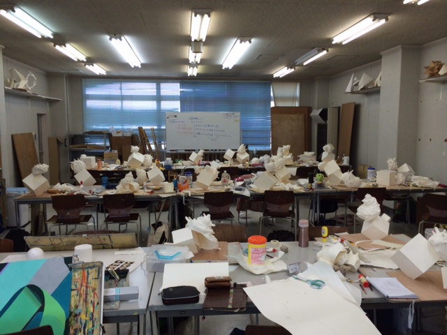 07 May 少なくともここは完璧! こんばんは、松野です。本日は七条校におります。立体の授業と美術史の授業、様子はこんな感じ。 制作後 保田先生による美術史立体の講評に入ったのですが、まだ制作数が足りてない生徒もいるとはいえ、言い切る強さをもっと欲しいという印象でした。まだまだここから!完成のビジョンのクオリティを高く追求していきましょう!講評時に自身の制作の話を少ししました。何かをつくりあげるのは、教科書通りにいくなんて事はありませんし、どのタイミングでビビッとくるかも分かりません。延々と単純作業の繰り返しになったりもします。だからこそ、どんなくだらない事でもこだわり抜いて良いのです。それは画面だけでなく、環境や、道具などもそうです。ようは、「一度こだわりきろうとしないと、どんな場面も始まらないのではないか?」と言いたいのです。ということで、少なくともここは完璧!!!というポイントを作ってみてはどうか?と思います。一箇所そういったポイントがあるだけでも劇的に見え方や、捉え方が変わると思うのです。そんな意識。お試しあれ!それでは。松野 [0回]PR 2014/05/07 (Wed) 19:38 アスクでのこと Comment(0)