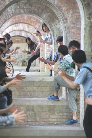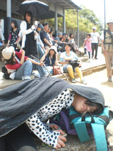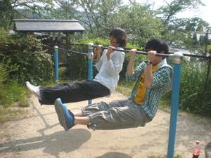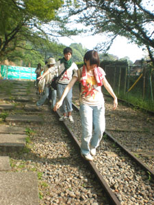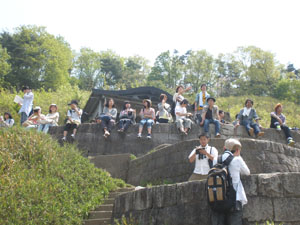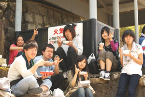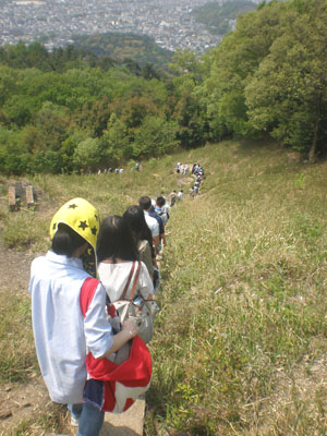17 May 大文字登山 5月上旬にSP.ST.WSSコースで大文字登山へ行って来ました。雨が続く中、この日だけは晴々としたとても気持ちのいい天気となりました。始めは平坦な道を歩いていましたが、だんだんと傾斜がきつくなってきたので、各々自分にあった杖をみつけたり友達に引っ張っていってもらったりと、楽しく登っていきました。やっとのことで登った頂上では、京都市内が眺望できました。各自持ってきたお弁当を食べて休憩です。中には、途中で購入した「たこ焼」をお弁当代わりにする生徒もいました。こんな場面も・・・!体力が回復したところで一気に下山です!めったに動かさない筋肉を使ったのか、足がガクガクなる人もいました。『膝が笑う』とはこういう事なんだと実感しました。下山後は哲学の道を歩きながら南禅寺へと向かいました。途中に小さな公園があったので、休憩をと思ったのですが、体力が余っているのか、鉄棒で懸垂を始める生徒も。南禅寺の水路閣へ到着。水路閣は実は疎水のことで、レンガで出来ています。普段アスクで授業を受けている事がほとんどですが、今回のように皆で外に出て自然を感じ体を動かすというのは、良いリフレッシュになったのではないでしょうか。こういう時間を皆で共有する事も大切に思います。次回、アスク全体でのイベントは夏終盤の「闇?やきそば大会」です!<ウエダ> [0回]PR 2010/05/17 (Mon) 17:33 アスクでのこと Trackback() Comment(0)