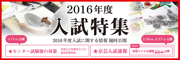 18 January 入試直前特集 こんにちは。受験生のみなさん、センター試験お疲れ様でした。ここから入試まで、まだまだ気は抜けませんが、今日はそんな入試に関する情報をお知らせします。 ★2016年度入試特集★1/17(日)にさっそく第1弾が公開されました。京芸、さらに工学部系、建築系の実技対策についての情報を掲載しています。同じく1/17(日)にアップされた「京芸ファイル」の最新号と一緒にぜひチェックしてください。ちなみに、入試特集は2月にも更新を予定しています。2月には入試速報として、京芸の2016年度入試問題の解説を掲載予定です。詳しくは★2016年度入試特集★内をぜひご覧ください。本日、関東は雪で大荒れの天気のようですが、京都は比較的落ち着いています。と言ってもやはり寒いのには変わりありませんが。防寒対策をしっかりして、体調管理には気をつけて、受験生は入試までの1日1日を大切に過ごしてください。坂谷 [0回]PR 2016/01/18 (Mon) 17:03 アスクでのこと Comment(0)