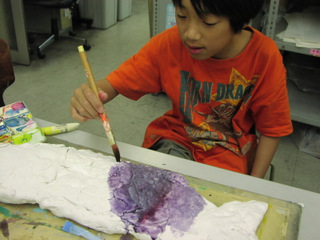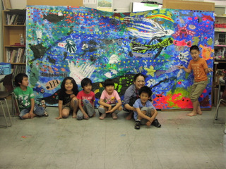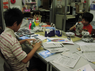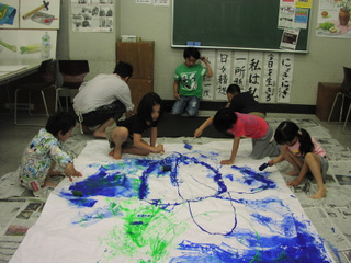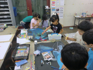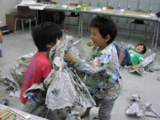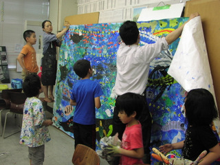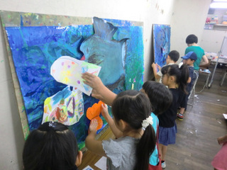 17 June 海 こんばんは。サカグチです。 ASKの北山教室、七条教室では、土曜日の午前中にこども造形表現教室を行っています。 4歳から12歳までの生徒が通っています。 力作ぞろいの作品ギャラリーはこちら⇒■■ 先週の土曜日、キッズ(小学生未満 4歳~)とジュニア(小学1年生~3年生)のみんなは大きな海を描きました。 北山の海⇒ 七条の海⇒ 写真左側のオレンジ色のTシャツの男の子の指示に従い、完成した海を貼りました。 「センセイ、右側が下がってる!」 こっちは、片付けてるんだか、遊んでるんだか……。 右側の男の子は入会して間もないので、実はこのふたり、さっきまで話してもなかったのに、急に仲良くなっていました。自己紹介とか挨拶とかなしで、一瞬で仲良くなれるのがいいなぁと思いました。 アドバンス(小学4年生~6年生)は、先週考えたそれぞれの「深海魚」を、今週、紙粘土でつくりました! 先月には、紙粘土と絵具で「お弁当」を。結構、そっくり。 サカグチ [0回]PR 2012/06/17 (Sun) 16:27 こども造形表現教室 Comment(0)