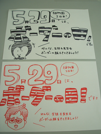 19 May ボーダーの日 こんにちは。ナカニシです。暑い日が続いていましたが、今日は久しぶりの雨ですね。荷物が多い日などは憂鬱になりますが、雨は結構好きです。北山、七条の高卒生は5/27(月)~5/29(水)は京都府立植物園に行き、スケッチをします。そしてなぜかは分かりませんが、最終日の5/29(水)は「ボーダーの日」となっています!昨年度から始まったらしいです。七条STのCuteな2人が書いてくれました。北山、七条受付前のテーブルに置いてますよ。昨年のボーダーの日の様子ボーダーって夏だ!って感じがしませんか?私の夏服クローゼットはボーダーばっかりです。みんな、ボーダー着てきてねーー!おまけです。この間の続きとして知っておくと便利な接頭辞について書きます。今日は「co] [re] の2つです。これは知っている人も結構いるのではないでしょうか。[co] は 「共に」という意味を持っています。なので [cooperate] だと[co] 共に + [operate] 操作する で「協力する」という意味に変化![re] は「再び」です。なので [review] だと[re] 再び + [view] 見る で「もう一度見る」という意味になります。原子記号みたいですねーー。接頭辞を知っているだけで、語彙力がかなり増えますし、新しい単語を覚えやすくもなります。ぜひ覚えて下さいね。ナカニシ [0回]PR 2013/05/19 (Sun) 14:30 アスクでのこと Comment(2)