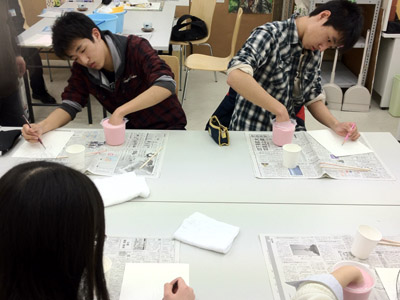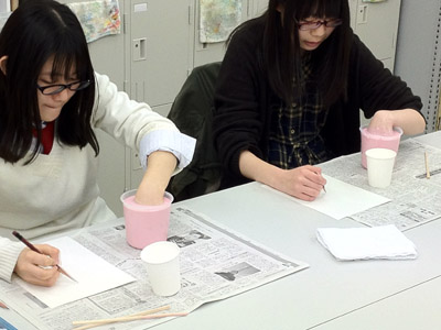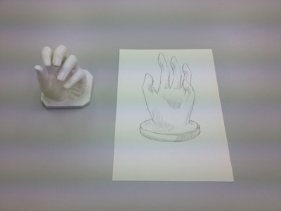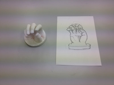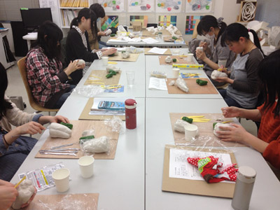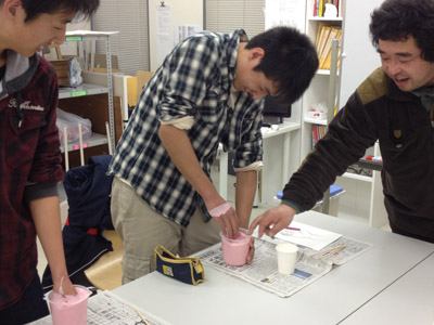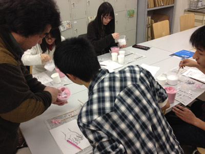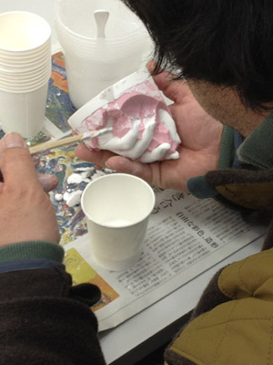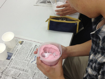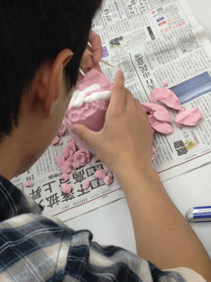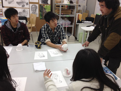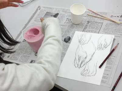 06 April 大阪成蹊芸術学部 美術 体験授業 こんばんは 保田です本日、草津教室で行われた大阪成蹊大学芸術学部岩野先生を迎えてのワークショップを報告します。岩野先生は保田の大学時代の先輩当時から世話になりつづけている人です。これまでも何度も成蹊大学芸術学部からワークショップや講演に何度も来てもらっています。宝塚の手塚治虫記念館の仕事など様々な活動の話や、最近では成蹊での教え子がハリウッドでフィギアが認められて国際的に活躍しそうになっている、などなど、具体的な話を通じて若者達のモチベーションをどこまでも高めてくれるほんとに熱い先生です。しかし、今回は、話をしだすとそれだけで4時間たってしまう、ということで、お話はそこそこにしてもらい作業に入ってもらいました。(講演会もぜひまたお願いしたいです)ちなみに先週、京芸対策で石粉粘土を使ったピーマンの模刻を行いましたが、今回は、コピックという海草から抽出された液体を使って「手そのものを石膏どりする」ということで模刻とは少し異なります。京芸対策模刻授業 模刻作例コピックと水をしっかり混ぜ、手を入れてしばらく待ちます手を突っ込んだ後になって、「残っている手で中を想像して手をスケッチしなさい」という指示が!「自分の手のポーズをしっかりイメージして!!」コピックはいわば「寒天」のようなもので固まったら、ゆっくりと手を抜き出します手が出てくる瞬間は「もう一回生まれてくる感覚」次は、石膏を水に溶かし、手を抜いた穴に流し込むのですが、これが以外とかなり難しい…気泡が出来ないよう注意しながら、奥まで入るよう回しながら「指の曲がり方(外からは見えない)をしっかりイメージして」流し込んだ後「中の手を想像して想定デッサンしましょう」今回は両手が使えるのでしっかり描けるはず「中でとっていたポーズをしっかりイメージして!」石膏が固まったら、コピックを割り箸でそぎ落とし手の石膏像を取り出します。最も楽しみな瞬間。わくわくするが「慎重に」完全に固まってない石膏はやわらかい。折れやすい。流し込みに失敗した生徒は指先がない!しかし、「そこで終わりじゃないのが美術系なんだ!」ということで、もう一回石膏を溶いて指をつけます。これは技術がいるのですが…今回は岩野先生が直してくれました。今回のポイントは「イメージ」何度もその言葉が出てきましたが途中、想像でスケッチやデッサンをしたのも実は、石膏を流し込んだり、コピックをそぎ落とす時中味のイメージがしっかり持てていないと失敗するとのこと。なるほど、待ち時間だからデッサンの練習をさせたということじゃなくて、理由があったんですね。完成作品と想定デッサン ※指の曲げ具合イメージできてた?最後はイメージすることの大切さ、そして、イマジネーションを鍛えるために、受験時代にやるデッサンがいかに大切かという話でまとめてもらいました。うーむ、すごい説得力。入試課の山本さんからは、4月29日(日)のオープン・キャンパスの紹介がありました。この4月大阪に移った成蹊大芸術学部のアトリエお披露目的なオープン・キャンパスなのですが特にお勧めがアニメーション・キャラクターデザインコース教授の糸曽先生が監督した作品「コルボッコロ(完全版)」の上映と解説とのことです。スタジオ・ジブリで仕事をされていた方で、その辺りの話も面白そうです。さて、ブログでは紹介すべて紹介はできませんが岩野先生からは様々な話をしてもらいました。岩野先生も当日は現地におられますので、もっと話が聞きたい方もぜひオープン・キャンパスに参加されてはどうかと思います。保田(明日は草津教室入学オリエンテーション) [0回] 2012/04/06 (Fri) 22:46 滋賀・草津駅前教室 Comment(0)