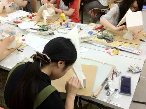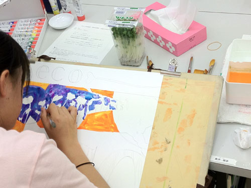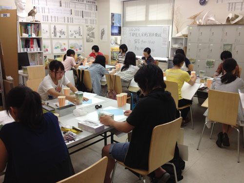 01 August 草津教室 2012・8・1 こんばんわ 今日は草津教室の様子を紹介します。 こんな感じで、アスクの中では最小の草津教室も満員に近い状況でにぎわっています。 第3期間は、京芸対策4名、国公立対策2名、AO対策5名、基礎2名 合計13名が対策を行っています。(明日は週1で来られるNさんが来られるので14名)その中で今日は特にAO対策と京芸対策を紹介します。 ◆AO対策 志望コースはそれぞれ異なりプロダクト、キャラクター、マンガ、現代美術・写真など様々。しかし、具体的にやっている対策課題は異なっても 内容的には重なる部分が多く、隣の生徒に指導している内容 (例えば、デザイナー、エンジニア、職人の違いとは?なんて話)を別の生徒も聞いていて自分の制作につなげたり、ということも多い。 それぞれ、資料となる本や雑誌など持参していますが 途中でネットで資料探しということもある。 しかし、調べ出すと、それだけで時間をくってしまうので要注意。 そして、最後のプレゼンは全コース共通で行います。正直、まだまだ安心できない。ラスト数日での飛躍が期待されます。しかしプレゼンといっても大切なのは、内容。内容がしっかりしてれば、伝えるべきことも明快で話しやすい。内容のないものを「しゃべくり」で誤魔化すことはできません。しっかり考えることが大切です。 ◆京芸対策 1日2課題着彩描写。 着彩は試験科目からは外れましたが、対策は必要です。 着彩をすることで、描写力が鍛えられるという面がありますし 色彩でモチーフ構成が出た場合、着彩力は非常に重要となります。 午前は基礎力強化、ビール瓶の描写。これはなかなかうまくいったと思います。 導入ではアスクギャラリー掲載の作例(別教室では既に実施されていた)を利用できたのもよかった。 しかし、午後のより実戦的な「簾、カラーボール3個」は、もう一歩の出来。 明日の色彩課題(モチーフ構成) ※これも今週のアスクギャラリーに作例あり では、カラーボールがモチーフの一つです。 本日の経験を活かして、うまく表現してほしいと思います。 保田 [0回] 2012/08/01 (Wed) 20:57 滋賀・草津駅前教室 Comment(0)