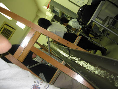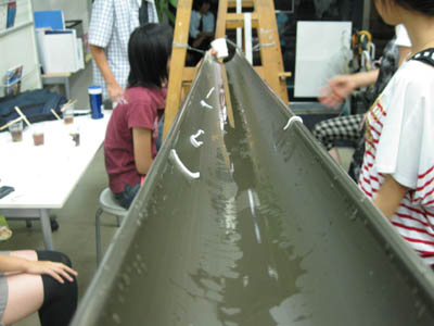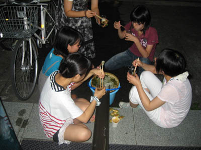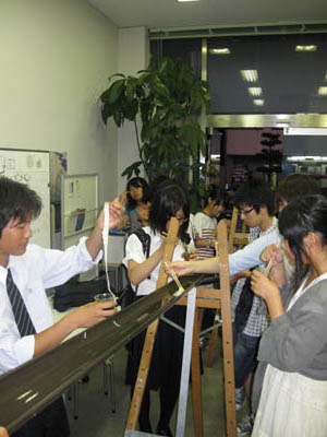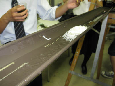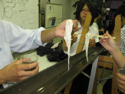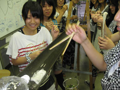 13 August 流しそうめんin彦根教室 毎年アスクでは、夏期講習の恒例行事として、北山教室で「やきそば大会」を行っていますが、今年は、彦根教室でも何か行事を!!ということで、昨日彦根教室にて!夏らしく!「流しそうめん大会」を開催しました!! 残念ながら、そうめんを流すレールは竹ではなく塩ビニパイプ(雨樋に使うやつですね)、レールを支える支柱も竹ではなくイーゼル(さすが美術予備校!)、そうめんつゆの入れ物はプラスチックコップ(モチーフではありません)ですが、なんとかそれらしい雰囲気を作ることができ、途中、予定していた方法では水が流れないというハプニングに見舞われながらも、無事にそうめんが流れました。 僕自身、流しそうめんなるものは初めてでしたが、流れるそうめんを食べるだけなのに、下の方の人になかなかそうめんが流れずに文句を言ってみたり、大量のそうめんを流しすぎて箸でつかもうとしたらレールからはみ出そうになったり、不公平だと場所変えをしたり、ねぎ盛りそうめんや、のり盛りそうめん、(わさび盛りそうめん)を流してみたり、だんだん皆おなかいっぱいになってきたら下のざるに大量のそうめんがあふれていたり、下にたまったそうめんを食べたり、などなどなどなど色々と面白い要素があり、すごい盛り上がりますね。たまったそうめんを食べながら井戸端会議の図。最終的には、ポテトチップス(わさびの乗せ)やポッキー(しょうが付き)、パイの実(わさび入り)などなど…、そうめん以外のものも色々と流れていましたが、おいしく??いただくことができました。生徒たちも、普段とはちがう教室の雰囲気に大盛り上がりしていた!はずです。これは、彦根の夏期講習恒例行事になる予感です。でも準備が意外に大変…。<S.I> [0回] 2011/08/13 (Sat) 23:40 彦根教室 Trackback() Comment(0)