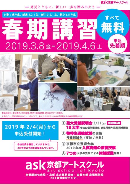 入試最終日の2/26(火) 18:00に、「京都市立芸術大学 入試速報」として2019年度京芸入試の解説をHPへ掲載いたします。