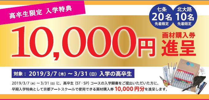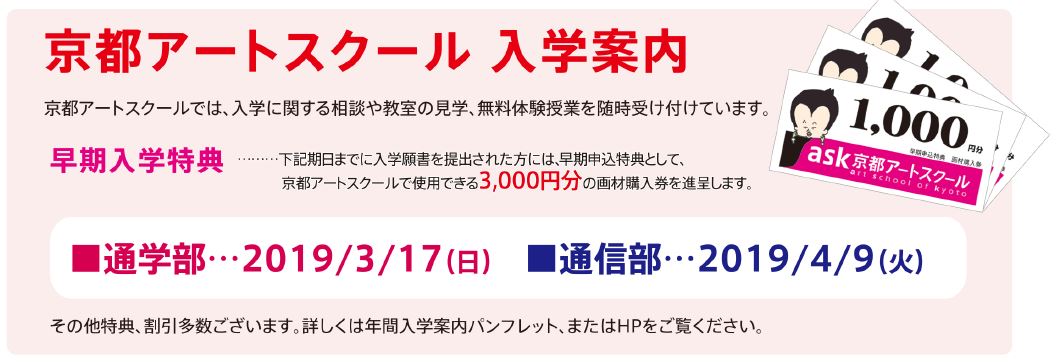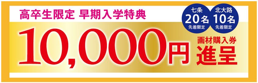 早期申込期限までに願書提出で3,000円分の画材券を進呈しますので、早めに提出しましょう。