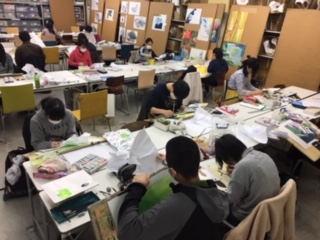 30 March 色彩構成とキャラメルコーン こんにちは。七条校の辻です。少しずつ桜が咲いてきましたね。ASKの春期講習も最終週に入りました。今日は七条校では色彩の課題を制作しています。2F、3Fでは京都市立芸術大学の色彩対策課題として、先日行われた2020年度入試で実際に出題された課題を制作しています。自分でコピー用紙に皺を作り、それを観察して色彩構成をします。平面な紙を加工することで、部分的に立体的になり、そこに明暗が生まれます。そこにどのような色を乗せるのか、画用紙の枠内にどのように構成するのか、生徒は皆真剣に課題に向き合い悩みながら制作しています。4Fではキャラメルコーンからイメージした色彩構成を制作しています。色彩構成の経験がまだ少ない生徒も多く、アクリル絵の具の使い方も探り探りです。経験が少ないうちは見た目の色や形にに引っ張られすぎて、なかなか魅力的な画面が作れないと思います。少しずつ経験を増やしていき、柔軟な発想や物の見方で色彩構成ができるようになってくれたらな、と思います。そのためには普段からただなんとなく物を見るのではなく、考えながら、色んな見方で物を観察してもらえたら良いかなとおもいます。最後になりますが、キャラメルコーンのピーナッツは袋の中身にまんべんなく塩がいきわたる為に入っているそうです。まんべんなく塩をまぶすことは意外に難しいようで、塩をつけたピーナッツが袋の中を移動することで全体に塩が行きわたるみたいです。塩を入れると夏場キャラメルが溶けにくくなるそうです。皆さん知ってましたか?私は甘いキャラメルの口直し的な意味で入っているのだと思っていました…。 辻 [0回] 2020/03/30 (Mon) 13:49 アスクでのこと Comment(0)