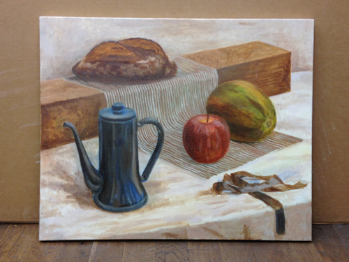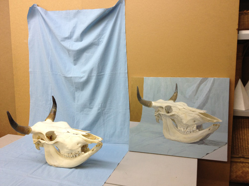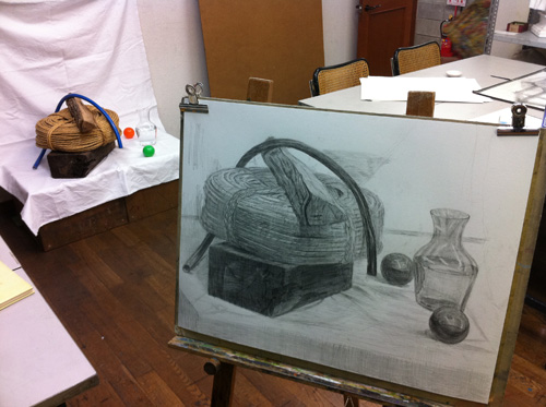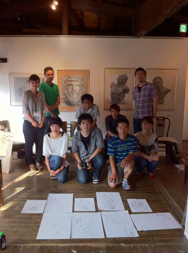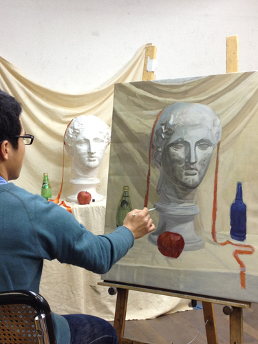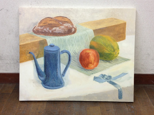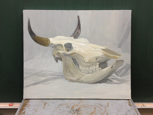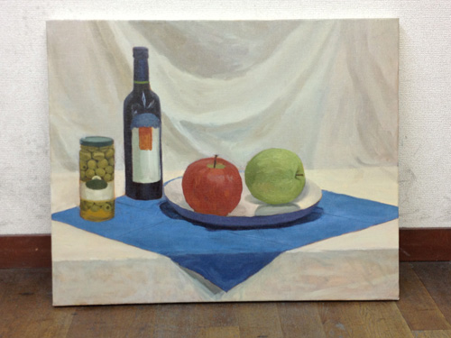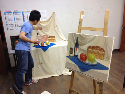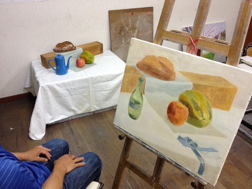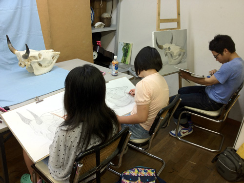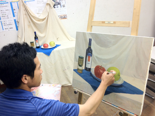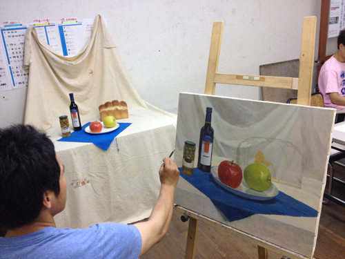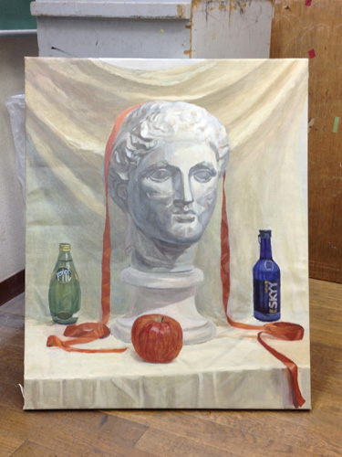 06 October 美術倶楽部報告 U君の場合 保田です。本日は、アスク美術倶楽部の紹介です。北山校は長らく保田が担当しております。老若男女様々なメンバーが在籍する美術倶楽部ですが、本日紹介したいのは、中でも最もがんばっているU君の軌跡です。2年前の夏に第一回美術倶楽部展を行いました。その後の軌跡。 参加者の記念撮影(大分メンバー入れ替わってますね) 会場風景その時のU君の作品は石膏像大顔面と牛骨の鉛筆デッサンでした。 その後も1年ほど、鉛筆デッサンを行いましたが、次のステップとして油彩に挑戦しました。 デッサンはかなり上達したU君ですが、油彩はまったくはじめての経験。まずは、初心者向けの「リミテッド・パレット」という方法を用いて主に白いモチーフを描きました。「リミテッド」とは限定された、という意味なのですが、最初は白・黒・赤・黄の4色のみ。 牛骨は美術倶楽部の小学生メンバーといっしょに描きました。途中から絵具にブルーも加え、ほぼ自然色の表現にしました。 次は、やはり白い石膏をメインとした静物。しかし、りんごなどカラフルなモチーフもいくつか加えました。ここまでは、モチーフや保田が組みました。 次は色を6色まで増やしてスタート。まだ「リミテッド」ではあります。モチーフもほぼ自分で構成。これが難しいですね、意外と...。色は途中から、少しずつ増やしていっています。ある程度描いたところ(右画像)で、ふと、なんか足りない感じがする。 とのことで...山形パンが登場しました。途中からの追加ですが...割と自然に入った。この方がいいですね。 完成。 そして、最新作。今年の夏前から描きはじめているモチーフ。今回は、モチーフも全て自分で選び、絵具の制限も最初からなくしました。「リミテッド・パレット」は卒業です。...しかし、最初から色々な色を安易に入れ過ぎて、明暗が曖昧になってしまった。これでは空間性が乏しくなってしまう。実はこれ、まったくありがちな失敗です。ということで、再度、明暗を整えたのが右画像(この8月の段階)その後、少し展開していますが、まだ未完成です。なのですが、紹介はここまでとします。ほぼコンスタントに活動に参加しているU君ですが、週に1回なので、ゆっくりしたペースではあります。が、確実にステップアップはしていると思います。しかし、もっとスピードアップしてほしい、とも思う。そして、保田のアドバイスなどなくてもどんどん自由に描けるようになってほしいと思っています。完成作の紹介は「第二回美術倶楽部展で...」ということにしたいのですが、展覧会はまだ未定。保田 [0回]PR 2013/10/06 (Sun) 18:26 アスク美術倶楽部 Comment(0)