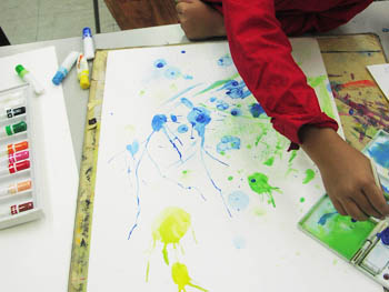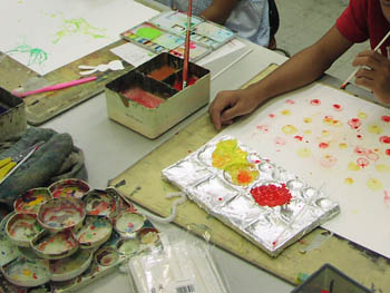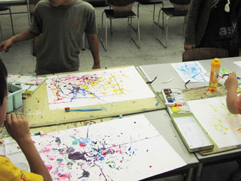 07 September 自由な教室 先週の土曜日のこども造形表現教室。 課題テーマは 「音を描こう」 生徒にヒーリング音楽?のサウンドトラック?のようなもの? を聞かせ、それを元に、絵具をたらしたり、息で広げたり、色付きシャボン玉を作って紙の上で割ったり、歯ブラシで飛ばしたりと、色々な方法を使って音のイメージを表現 なんですが、そのうちある生徒が、シャボン玉を作るための洗剤を筆洗に入れて、 ストローを使って ブクブクブクブク~~ ブクブクブクブク~~ もちろん筆洗の上には山盛りの泡が発生…。 ふと後を見ると、全員真似して ブクブクブクブク~~ 「見てっ!?こんなでかくなった!!」 「えぇっ!!どうやったらそんなんなんのっ!?」 「すげぇ~!!」 ブクブクブクブクブクブク~ 異常な盛り上がり…。 さらに、その筆洗の上にこんもりと盛り上がった泡に絵具を垂らし その上に画用紙をくっつけて描くという荒技に出る生徒も~! 楽しいからいいんですがね…。 ちょっと自由すぎますかね…。 でも、結構いい作品ができてるんだから良いですよね? ちなみに流している音楽は、 「うるさいっ!!」 「飽きたっ!!」 と、途中で何度もとめられました…。 皆何を元に描いたの?? <S.I> [0回]PR 2009/09/07 (Mon) 20:15 こども造形表現教室 Trackback() Comment(1)