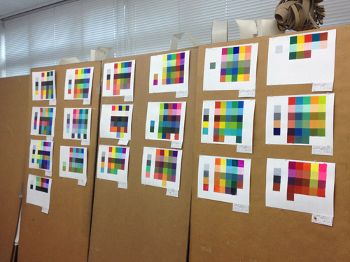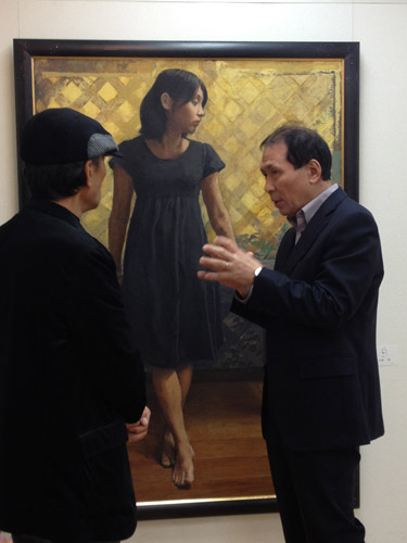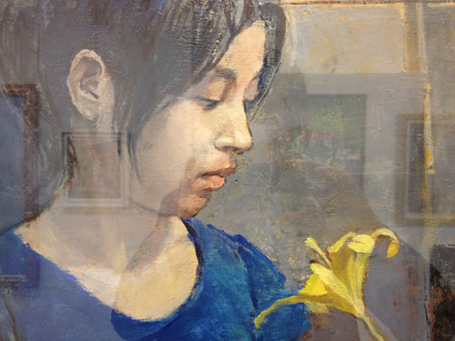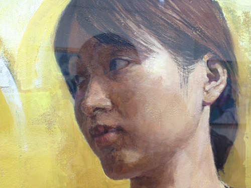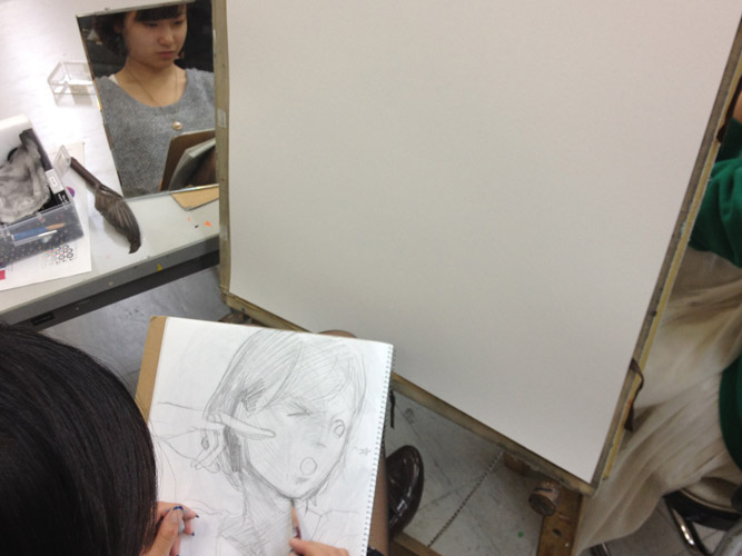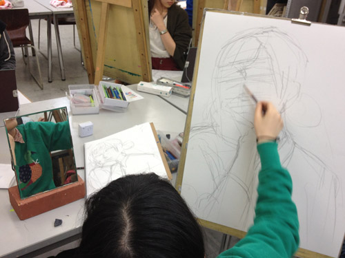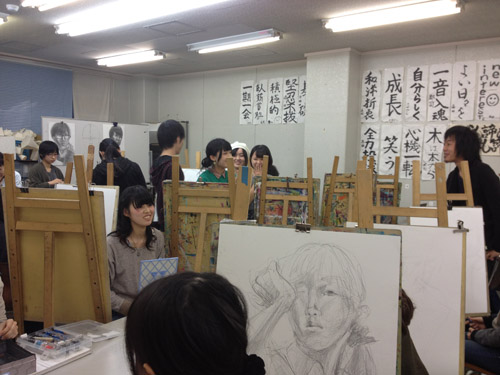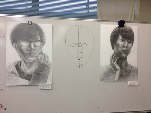 11 November 七条校指導・アスクギャラリー・アスク名物課題・佐渡先生個展 コンバンハ保田です。本日は七条勤務でした。午後はST生、造形トレーニングの指導を行いました。色彩のドミナントについて実戦的に学ぶ内容でした。今年から導入された新規課題だったのですが、彦根校(保田担当)、北山校(齊藤先生担当)と実施し、本日の七条校(保田担当)が最後でした。なかなか時間がタイトで、最初から散々せかしていたのですが、あと一歩で未完成の生徒がちらほら。隣の小学校の生徒がいい感じで太鼓をたたいて急ぎムード盛り上げてくれたのに...。結果はこんな感じです。未完成の生徒は、必ず、完成させること。理屈として理解しているのと、一回実践しているのとでは、理解度が全然違ってくるので...。3時からは「表情のある自画像」課題です。この課題も彦根、北山はもう終了しており、七条STSPと現役生が今週の予定。ちょうど本日からのアスクギャラリーで北山校の作品が3点掲載されています。ある程度、表情を強調することと、片手を入れることが条件です。 それぞれ、イメージする表情やポーズのエスキースを描いてから制作してますね... 左)上杉先生による導入では先に完成したWSS生の作品を参考に使われていました。右)本日の授業終了時の様子課題文の解説を抜粋すると・表情をつける事により「変化する部分」と、反対に「変化しない部分」の両方があります。頭部に対しての目、鼻、口、耳などのパーツのつき方など、基本的な構造を理解した上で、各々が設定した表情に伴う、筋肉の動きに着目しましょう。・表情をつける事により「変化する部分」と、反対に「変化しない部分」の両方があります。頭部に対しての目、鼻、口、耳などのパーツのつき方など、基本的な構造を理解した上で、各々が設定した表情に伴う、筋肉の動きに着目しましょう。なんてことが書いてあります。表情を描くことは非常に難しいことです。しかし、表情に気をとられると、もっと大切な骨格や筋肉などの基本がおろそかになる。難しい課題ですね。この課題は、アスクの名物課題というか、伝統課題の一つで、実は駿台美術科時代からやっているので20年近くやっている課題です。当時、京芸コースを担当されていたN先生(現在は画家)という方が考えられた課題です。(課題文化したのは保田ですが) N先生は現在は、プロの画家です。現代の美人画家という感じですかね。勝手に紹介したら怒られるかな? ⇒⇒⇒まあ、とにかくテクニックはバリバリの人でした。(当時、ペーペーだった保田に、先輩講師としていろいろ教えていただきました)課題文にリンクしている作品もすべて90年代のものです。一枚紹介しますと... ちなみに、この作品の作者は、現在HPで公開している『卒業生の選択』という冊子に登場している人です。トップバッターとして紹介されている、『職人』を選択している方です。(学生時代~卒業後しばらくはアスクの講師もしてくれていました。ちなみに、彼が『職人』を選択してしまい、アスクを辞めることになったので、誰かかわりを紹介してくれ、と頼んで、紹介された逸材があの上杉先生です)ところで、先週、副学長の佐渡先生が京都の寺町通りのギャラリーでグループ展に出品されていました。佐渡先生は金沢美術大学の油彩を卒業され、ずっと具象絵画を描かれて来られた訳ですが、近年、活動を活発化され、日展などにも出品されています。(ですので、12月~1月京都市美術館で日展の京都展があるので、見ることができます)今回のグループ展も、日展系のものとのことでした。保田としてはシフトを変更してまでも見に行かしてもらいました。というのが、佐渡先生は油彩・具象のテクニックがものすごくしっかりされているので、すごく勉強になるのです。かつてのN先生同様、今もいろいろ教えて頂いています。同じ油画でも『現代アート系』の保田とはちと違う(涙)。 会場風景 作品について語る佐渡先生さて、佐渡先生の今回の作品は人物中心。保田アイフォン撮影なので、ちゃんと撮れてませんが、紹介させてもらいます。(ガラスにうっすら保田が映っていたりします) 自画像じゃないけど、表情のある女性像ですね。表情っていっても非常に微妙な表情です。さっき、表情を描くのは難しいって書いたけど、あからさまな表情を描くのことよりも実は、微妙な表情の方が難しいんですね。デッサン力がないとこうは描けません。(ちなみに、色彩は写真ではまったく再現できてません)『なので、表情のある自画像』は、確かに難しいが、本当に難しいもの、ではありません。表情がないような表情の方がもっと難しい。『モナリザの微笑』って言うでしょ。いろんな人が模写しているけど、だいたい微笑が下品だったりする。へんなこと考えてそうな。あるいは、仏像。後期美術史(ST・SP生)で取り上げた仏像の表情。(無理に話題をつなげようとしてるんじゃないよ) ここまで来たら誰