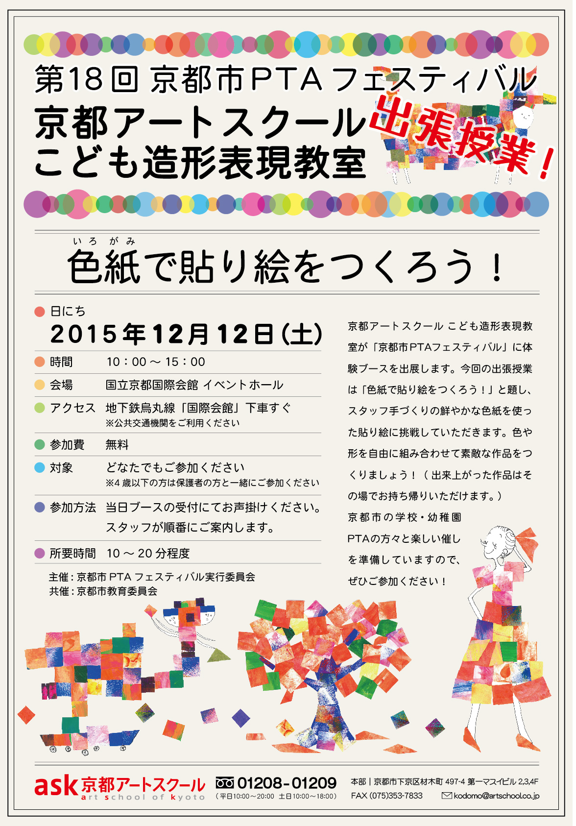 24 November こども教室の振り返り こんにちは。連休中、京都はどこもにぎわっていましたね。アスクでは受験に向け着々とすすんでいます。そんななか、こども部門も負けじと開講しています。こども教室は4歳から小学6年生までを対象にした教室です。2015年度は各方面と協力し、様々な活動を行っていましたのでふりかえりつつご紹介します。●5月GoGo土曜塾 体験レポート7.8月号 取材協力 ●6月特別授業「岩絵の具を作ろう!」特別講師:後藤 吉晃先生(京都造形芸術大学 日本画コース非常勤講師) ●7月特別授業「琳派を模写」 ●8月特別授業「表具に挑戦!」特別講師:物部 泰典先生(京都造形芸術大学 日本画コース非常勤講師) ●9月琳派こども作品展「古典への憧れ」9/5~9/9会場:京都市勧業館みやこめっせ ●10月福知山で琳派こども作品展出張展示10/1~10/12会場:福知山市児童科学館 そして滋賀 彦根駅前が2015年10月からオープンしました!・・・・・・まだまだ年度末まで活動は続きます。●12月彦根 クリスマス特別授業「お菓子の家づくり」 京都市PTAフェスティバル ブース出展協力 琳派こども作品展出張展示 第2弾(近日公開)ちなみにこども造形表現教室ではfacebookで授業の様子を公開しています。ほっこり癒される写真がたくさんあります。☞「京都アートスクール こども造形表現教室」こじま [0回]PR 2015/11/24 (Tue) 16:37 アスクでのこと Comment(0)