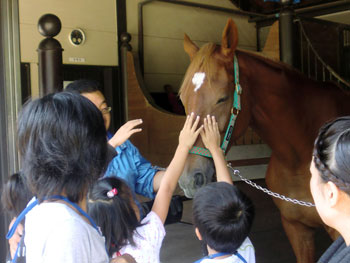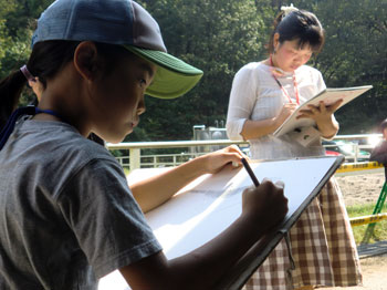 08 October 馬のスケッチ こんにちは、事務局の吉井です。(こども教室も担当してます)秋晴れの3連休。今日は「こども造形表現教室」の課外授業で馬のスケッチに出かけてきました。北山教室の最寄駅である北山駅から2つ北の「国際会館駅」を降りるとすぐに「宝ケ池公園」という大きな公園があります。その敷地の中に実は馬がいるんです。知らなかった人も多いのでは。平安騎馬隊といって、京都府警の騎馬隊で馬6頭が所属しています。ちなみに、彼らは競馬のサラブレット出身だとか。今は京都の祭(時代祭や葵祭)パレードで先導や、交通安全活動として出動し、活躍しているそうです。大文字、鞍馬、小倉など京都にちなんだ名前がつけられていました。厩舎は、毎日午前10時から午後4時まで開いていて自由に見学することが出来ます。せっかくなので、絵を描きに行ってはどうですか?では、今日の様子をすこし・・・ よしい [0回]PR 2011/10/08 (Sat) 16:53 こども造形表現教室 Trackback() Comment(0)