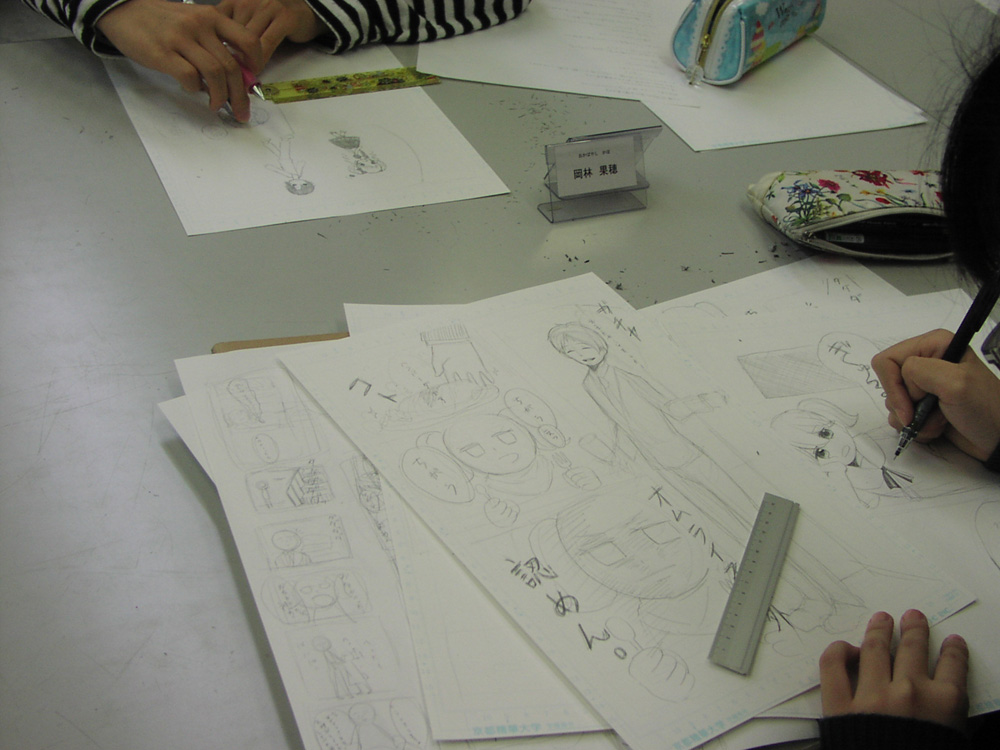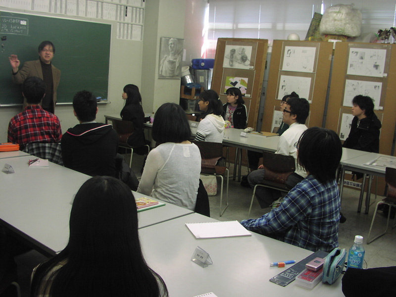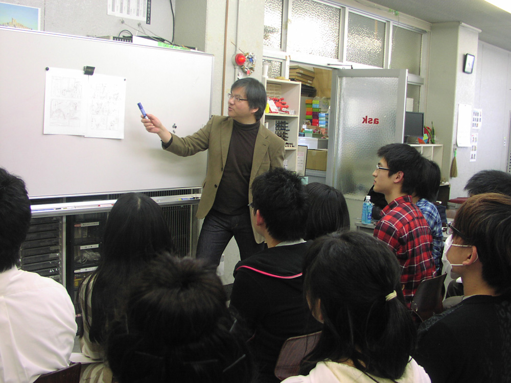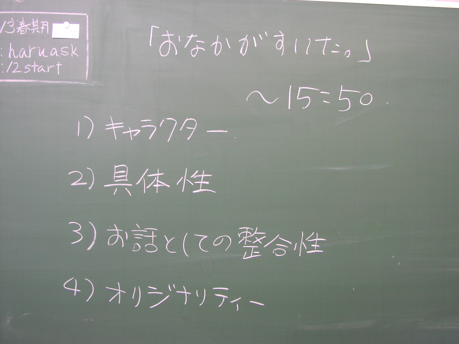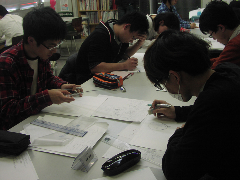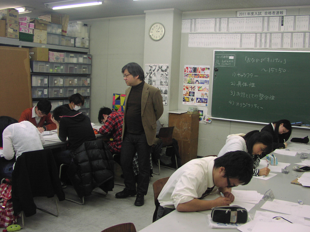 29 March 京都精華大学AO対策授業 本日、七条教室では、京都精華大学マンガ学科ストーリーマンガコースより、おがわ さとし先生にお越しいただき、マンガ制作の授業を行っていただきました。まず、丁寧な導入がありました。今日は次の事項に注意しながら「おなかがすいた」というテーマで制作していくことになりました。①キャラクター②具体性③お話の整合性④オリジナリティ たとえば、キャラクターについては、「ぱっとその人物がわかる」ことが重要だとおっしゃっておられました。その上で、ストーリーの中でギャップをつくるなり、そのままの性格を強調するなりして仕上げていくとか。また「突飛な人物は一エピソードに一人で十分」など、お話を練る上で、コツとなるようなことを、たくさん教えていただきました。早速制作に入ります。皆真剣そのもので、かなり集中して制作しています。制作時間が短かかったので、最後まで仕上げることのできなかった生徒もいますが、皆それぞれに趣向を凝らした作品が揃ったと思います。さて、講評です。順番に作品をはり出して一人一人おがわ先生に、これまた丁寧に講評していただきました。この講評が圧巻でした。瞬時に作品の構造を理解され、具体的な改善例をまじえながら、それでいて偏狭にならず、びしびし指摘が入ります。このあたりは流石です。第一線で活躍されている方ならではの生っぽい言葉がたくさんきけて非常に勉強になりました。皆も刺激になったようで、授業後もおがわ先生への相談が絶えませんでした。おがわ先生ありがとうございました。さて、精華大学のマンガ学科には、ギャグマンガコースとキャラクターデザインコースが新たに開設される予定です。とくにギャグマンガコースは、日本の大学で唯一のコースということもあって、個人的にかなり今後が楽しみです。はやし [0回]PR 2012/03/29 (Thu) 21:28 アスクでのこと Comment(0)