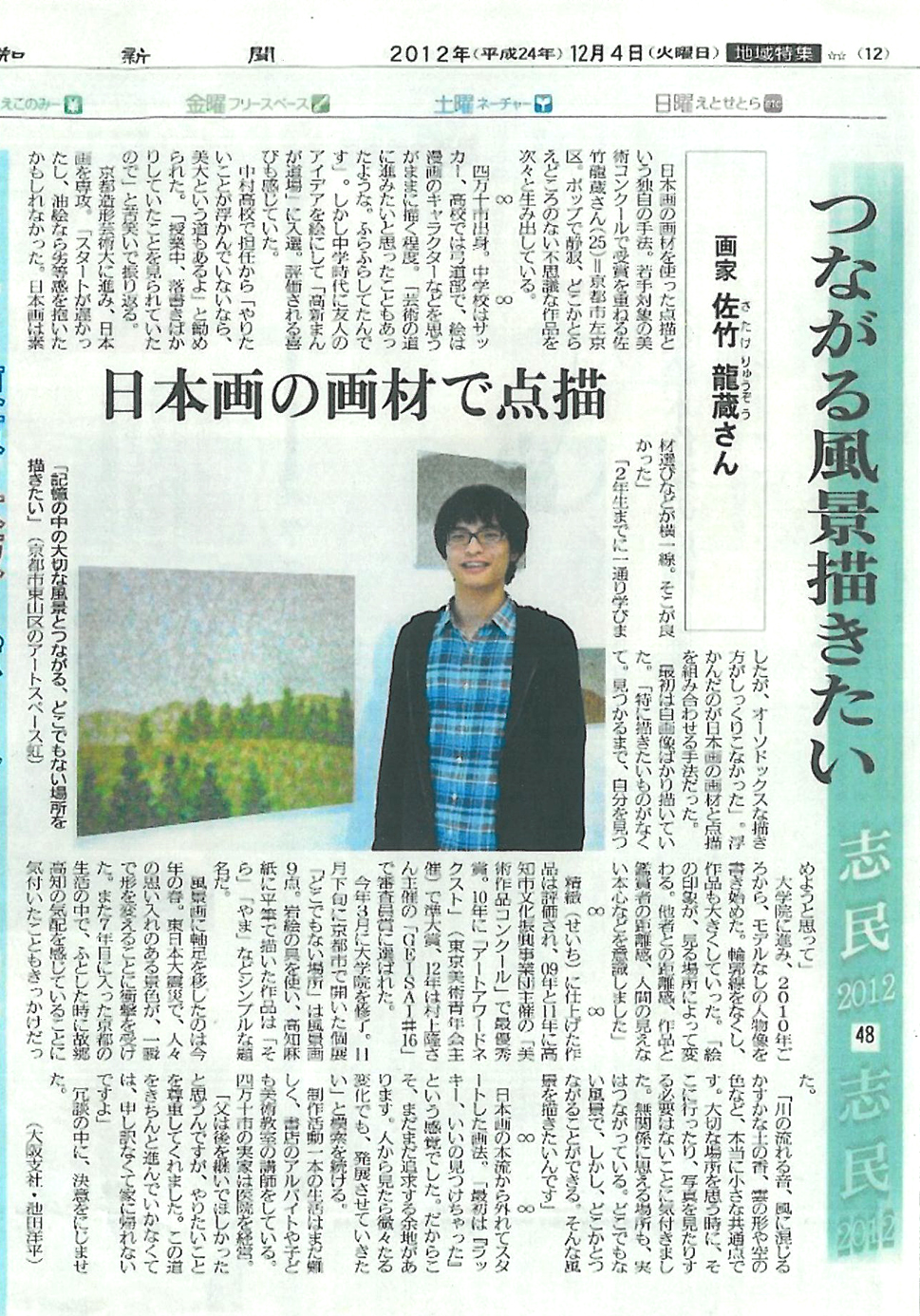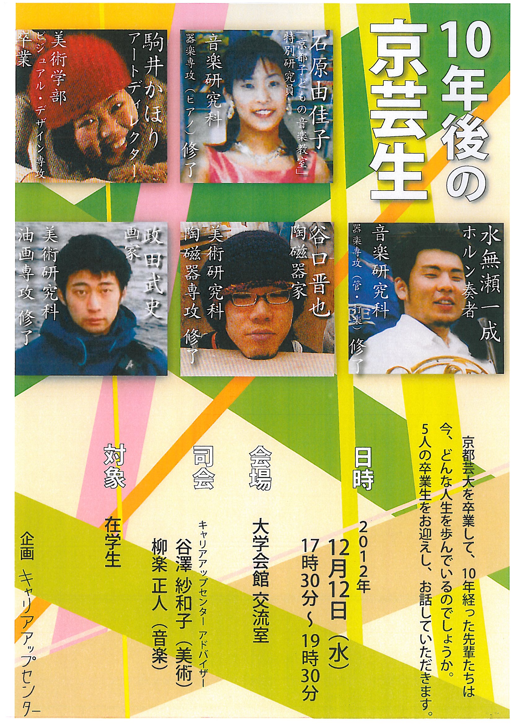 05 December 「10年後の京芸生」講演会のお知らせ サイトウです。京都市立芸術大学主催の講演会のお知らせです。12/12(水)17:30-19:30大学会館交流室10年前に京芸を卒業した5名が、それぞれの「今」を紹介し、芸大生の今後について考える機会にするという企画だそうです。美術学部卒業のパネリストは3名です。■駒井かほり アートディレクター (ビジュアルデザイン専攻 卒)■谷口 晋也 陶磁器家 (陶磁器専攻 卒)■政田 武史 画家 (油画専攻 卒)基本的には在学生が対象のようですが、「予備校生の方も是非」ということでご紹介いただきました。受験生はひとまず合格目指して目の前のやるべきことに集中してほしい時期ですが、高校1,2年生は是非!askスタッフで行きたい人も是非。サイトウもお休みいただいているので、行ってこようかなと思っています!要申込なので、行きたい人は12/9(日)までにaskへ連絡を!*さて、別のお知らせ。askにはこども造形表現教室がありまして、その北山教室教室長をしてくださっている佐竹龍三先生が地元の高知新聞で記事になったとのこと!ぜひご覧下さい。 <サイトウ> [0回]PR 2012/12/05 (Wed) 21:55 アスクでのこと Comment(0)