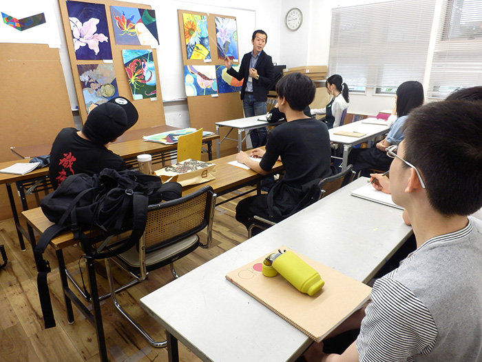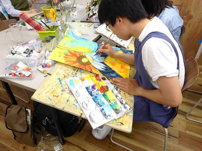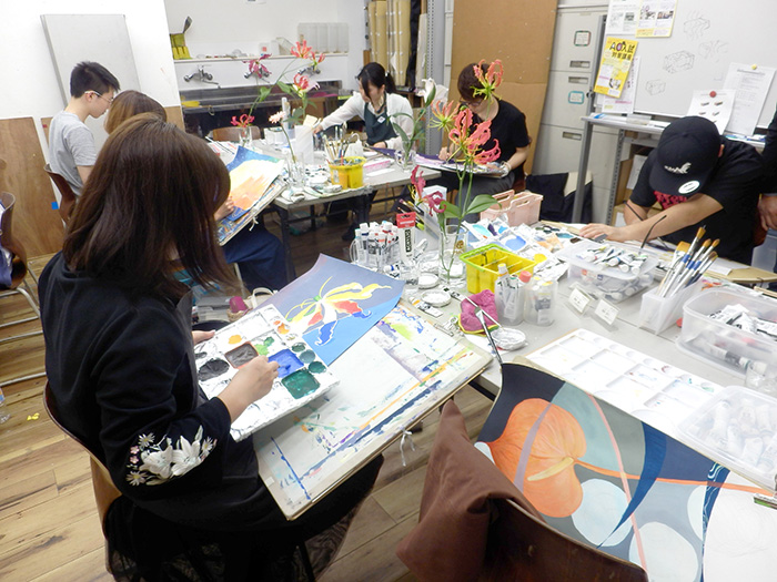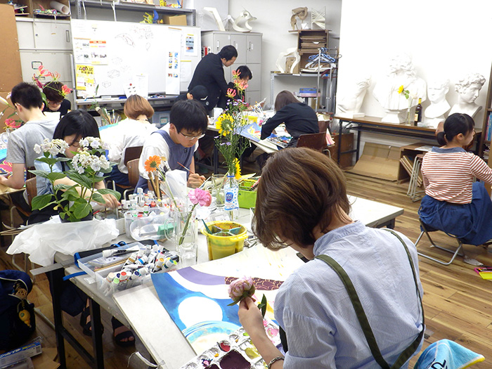 今回の授業では、各自、自分の好きな花を持参してモチーフとして描いています。