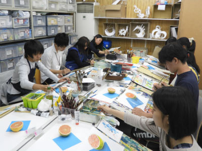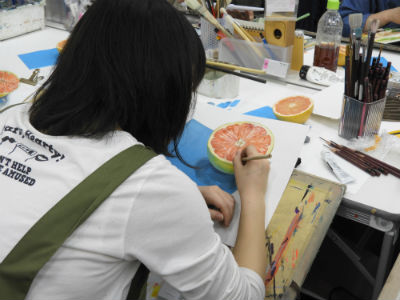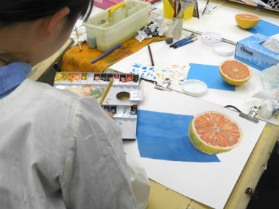 16 May 彩りを着ける こんにちは。七条校から武田です。今日はSTSP生の生徒たちはグレープフルーツの着彩をしています。 着彩は鉛筆と透明水彩絵具で描く、簡単に言えば色付きのデッサンです。東京藝大の日本画専攻をはじめとする、さまざまな大学の主に日本画専攻での課題となっている描き方です。 (↑彦根校にある私が浪人時代のときの着彩。)アクリルガッシュとは違い、色を重ねすぎると重たい印象になったり、色が濁ったりするので、苦手だという人も多いのではないでしょうか。ポイントは形と色と明暗のバランスをしっかり観察することです。形を整え、しっかりと混色し、的確な場所に色を置くことで、手で触れそうな空間感、立体感を持った、リアルな作品になります。着彩のリアルさは京芸色彩には必要ないのでは?と思う人もいるかもしれませんが、実際のモチーフの見え方や光の加減を、着彩を通して知ることで、色彩の課題にも活かすことができます。描ける幅が広がることで色彩表現の幅も豊かになりますよ。 STSP生たちは明日から植物園実習。長い時間をかけて着彩写生を行います。↓昨年の様子。 とても楽しみですね!本音を言えば、私も描きたい…(笑)明日からの3日間、雨が降らないことを祈ります。 [0回] 2017/05/16 (Tue) 14:26 アスクでのこと Comment(0)