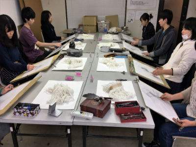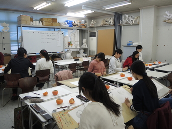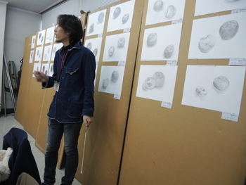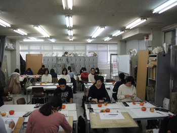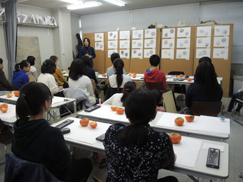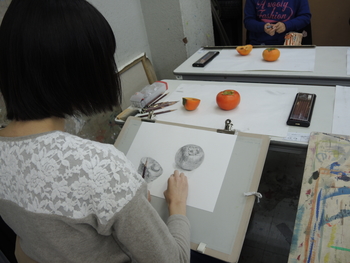 23 November 無料デッサン講座 本日はSTSPの授業と並行して、無料デッサン講座がありました。デッサンが初めての人も経験者もみなさん必死にモチーフと対峙していたように思います。モチーフは柿。季節ですねえ。 写真は七条校の様子。デッサン(ものの描写)というのは造形の基礎技術であって、いまだほとんどの大学で入試の科目に設定されています。そもそも入試でデッサンを課すことで、大学は何を見ているのかと。僕の勝手な解釈ですが、恐らく「誠実さ」ではないかと思います。大学に入ってから、誠実にものを作っていけるのかどうか。ものの描写でウソをついてはいけません。誠実に観察しなければ決して良い作品にはならないと思います。あるいは、せっかく誠実にものを見られていても、これまた誠実に表現しないと真に迫るデッサンにはならないのではないでしょうか。なので、意外と経験の少ないの人のほうが、良い描写になることもしばしばあります。なまじテクニックがついてくると、目の前のものを見ずに描いてしまう、そんな事態によく出くわします。浪人生は要注意。無料デッサン講座で食い入るようにモチーフの柿を見ている参加者を見て、そんなことを思いました。林 [0回] 2016/11/23 (Wed) 18:18 アスクでのこと Comment(0)