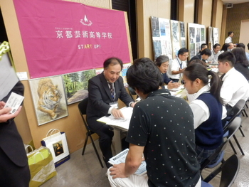 30 May 美術系高校 受験対策説明会を行いました こんにちは5/29(日)、美術系高校 受験対策説明会を行いました!今年で3回目となる説明会ですが、京都・大阪の美術系コースのある高校 すべてにご参加いただきました。一堂に会する機会はなかなかありませんので、大変貴重な時間でした。中学生、保護者、教員の方から合計62名のご参加がありました。 高校紹介では、各校の特色、取り組み、学校の様子などのご紹介がありました。生徒が制作した動画や、進路状況などがあり、学校のホームページやパンフレットだけでは知れない、魅力を知ることができました。 アスクからは、「美」美しく見える理由、「術」それを表現する技術 についてなど、受験対策の方針にしぼった話をさせていただきました。そのあとの個別相談会・アスクの合格再現作品展では、たくさんの方がブースに参加され、終始盛況な会でした。 「質問内容を考えていなかったが、話してみて魅力が伝わった」「一度のいろんな高校が知れてよかった」などの声がありました。今回の説明会では、府立、市立、私立の高校にお越しいただきました。さて、私立の高校は、学費がとても高いのかというと、実はそんなことはありません。私学に通う方を対象に、京都府や大阪府では学費等の負担を軽減する事業を行っています。(詳細は、各高校にお問い合わせください)京都府http://www.pref.kyoto.jp/bunkyo/1335331059139.html大阪府http://www.pref.osaka.lg.jp/shigaku/shigakumushouka/もちろん、府立、市立の高校も府や市からのバックアップがあるので、美術館での作品展をはじめとして魅力がたくさんあります。公立、私立にとらわれずに、自分にあった学校を探してほしいと思います。いまの中学3年生の方の中には、「具体的になにをしたらいいのかわからない」と思われる方もいらっしゃるかもしれません。百聞より一見にしかずともいいますので、まずはどんな試験科目なのか、受験してみてください。やってみて知ること、発見できることが必ずあります!6/12(日)美術系高校 実戦実技模試小島 [0回]PR 2016/05/30 (Mon) 14:23 アスクイベント Comment(0)