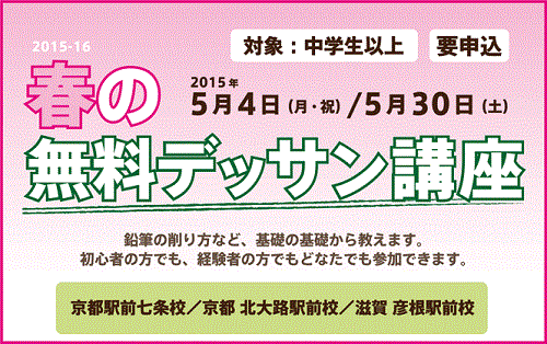 14 April 春の無料デッサン講座 こんにちは七条校の片岡です。新学期が始まって京都アートスクールでは2週目に入りました。少しは教室になれてきた頃でしょうか。本日は京都アートスクール3校で行われる春の無料デッサン講座のお知らせです。中学生以上の方であればどなたでも参加できます。鉛筆の削り方など基礎の基礎から指導しますので是非ご参加ください!■日程①5月4日(月・祝) 13:00~17:00 ②5月30日(土) 9:00~13:30■場所京都駅前七条校、京都 北大路駅前校、滋賀 彦根駅前校>>アクセスはこちら ■定員各校16名■対象中学生以上の方※初心者の方でも、経験者の方でも、どなたでもご参加いただけます。■持ち物鉛筆デッサン用具(鉛筆、ねり消しゴムなど)※カルトン、鉛筆デッサン用具は各教室にて貸し出し可能ですが、数に限りがございますので、貸し出し希望の方はあらかじめご連絡ください。■受講料無料※画用紙、モチーフは当日購入していただきます。(計400円以内)■申込方法①申込書をFAX、郵送、もしくは教室で直接提出②お電話③申込フォーム こちら参加お待ちしております。片岡 [0回]PR 2015/04/14 (Tue) 19:27 アスクイベント Comment(0)