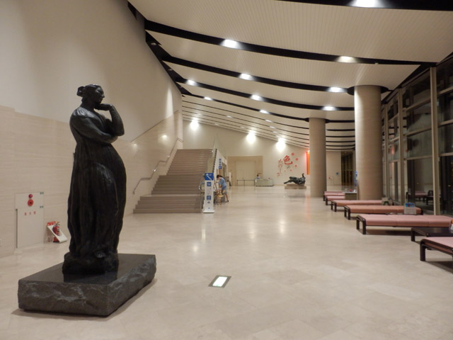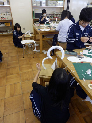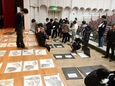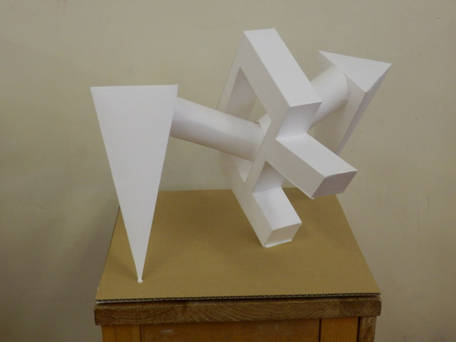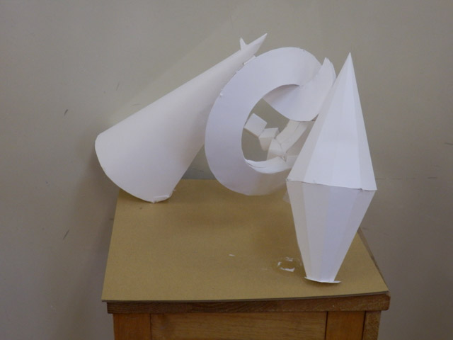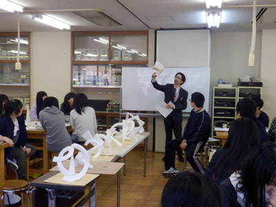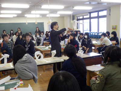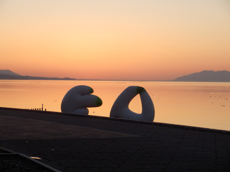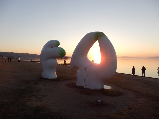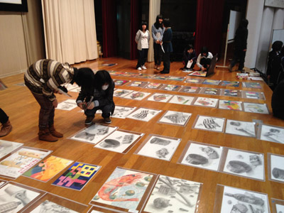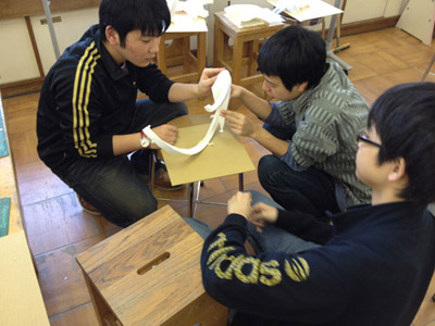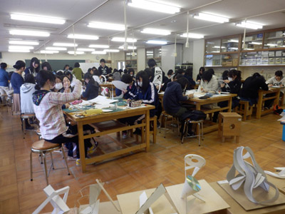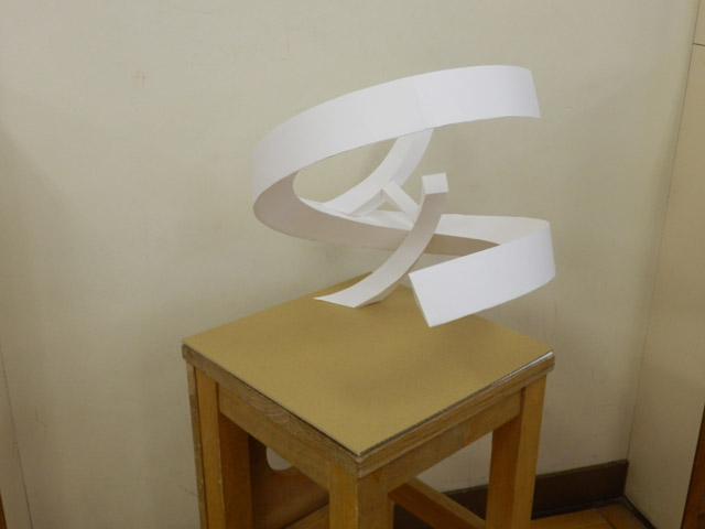 05 February 松江・出雲 彫刻講習会 こんばんは保田です。1月28日~31日にかけて島根県に行ってきました。出雲市にあるサンレイク出雲で開催された島根県の高校美術部の実技合宿(彫刻講習会)に講師として呼んでもらいました。保田は2011年に続いて2回目の参加です。28日・29日は松江地区、30日・31日は出雲地区の彫刻講習会ということで、島根県の3つの地区のうち、連続して開催された2つの地区講習会に参加しました。前日夕刻、松江入りし、まずは島根県立美術館に行きました。 ここは3回目ですが、素晴らしい美術館です。毎回企画展も面白いし、常設展はかなり充実しています。しかし、なんといっても最高なのが宍道湖畔のロケーションと設計。宍道湖畔に開かれた広々としたオープンスペースの屋外彫刻は湖と空が背景となってすごく見栄えが良いのですが(京都にある屋外彫刻の大半は背景がゴチャゴチャして見づらい)夕暮時など、その「背景」の方がさらに魅力的だったりします。今回も閉館前1時間の訪問でしたが、多くの人が日暮れを見ていました。 中:建畠 覚造、右:渡辺豊重 (ちなみに建畠 覚造氏は京芸学長建畠 晢先生のお父様です) 籔内佐斗司《宍道湖うさぎ》しかし、もちろん美術館に来た目的は「彫刻講習会」の導入授業のための資料作成です。「立体構成」とは何か?を説明するための資料として立体作品の撮影に来ているのです。あくまで仕事、仕事で来てます。宍道湖観光ではありません。(言い訳のようですが...)しかしこんな美しい夕日は前回ここに来た時以来じゃないかな。思わず合掌してしまいました。 屋外の作品を一通り撮影した後、館内のブールデル、マイヨール、アルマンの作品を撮影。全ての角度から魅力的に見えることを説明するため、それぞれ四方八方から撮影しました。有料会場にあるロダンは撮影禁止なので無理でしたが...。しかし、屋外の作品群はもちろん、館内のブールデル、マイヨールが常に無料で見れるというのは素晴らしいですね。常設展示会場のロダンもたった300円ですし。僕は特にブールデルが大好きなのですが、マイヨールも最高にいいですね。それと、美術館全体の(ロケーションをふまえた)環境設計や空間構成も勉強になります。さて、当日ですが、松江地区、出雲地区ともに約70人の生徒が参加。前日撮影の美術館彫刻群の紹介も含め、1時間程度の導入の後、まずは、グループ予備制作。(2時間半)4、5人ずつのチームに分かれ、三角柱スパイラルと四角柱スパイラル、三角錐を作成して、構成。台板に接着する際、3点、あるいは1点と1線(直線)、1線(曲線)、1面のみによる接着、が条件。ここでは、三次元曲面を持つ立体の構成法、独立のりしろ、等指導し、作図~カット~折込~接着などを体験してもらい、複数のパーツによる構成の際の最終段階の重要性を認識してもらいました。 右作品:予備制作の優秀作例 予備制作の講評~本制作「イニシャルによる立体/空間構成」の導入。本制作は6時間。課題は、各自の名前のイニシャル文字(ローマ字)をケント紙で立体化(閉鎖立体)して構成。初心者含む高1・2生に短時間で、創意工夫しながら完成できる課題ということで、半年間悩んだすえ新たにつくった課題です。美術部員といっても、大半の生徒さんは油絵など絵画制作を活動が中心な訳で、立体ははじめてという生徒も多かったのですが、さすがに美術部員、みなさんすごく積極的でした。 僕も高校時代は美術部員でしたが、こんな地区合宿があったら楽しかっただろうなと思います。島根県では夏は油絵の合宿、冬は彫刻(例年は石や木を削ったりする制作ことが多いとのこと)と年2回も合宿があるようです。うらやましい。サンレイクもすごく居心地よい施設ですしね。先生方は大変だと思いますが。講評時はそれぞれ10点を優秀賞として選出しました。 ◆松江地区の優秀作例から5点◆ WKくん、HSくん、HAさん HMさん、MRさん松江地区はクオリティーの高い優秀作品が多かったです。特にWKくん、HSくんの作品は秀逸ですね。トップ賞は設けませんでしたが、今選ぶとしたら松江地区はHSくん作品ですね。ほとんど大学合格レベルのクオリティーですね。◆出雲地区の優秀作例から5点◆ SMさん、YSさん、NYさん SKくん、OMさん出雲地区はアイデアがあり積極的な優秀作品が多かったです。特に、とげとげしい自分の性格を表現したSMさん、自分の先祖が海賊であることテーマにしたSKくんの作品は印象的。出雲トップ賞を選ぶとしたらSKくん作品ですね。ここまで作りこまれると納得するしかない。全体としてはケント紙立体初心者が大半だったので、加工精度などもう一歩の作品が多かったのはもちろんですが、それぞれに工夫のある作品で好感が持てました。今回は、2回連続ということで4日間ぶっ通しの指導。かなり疲れもしましたが、素直に立体構成を学び、楽しむ生徒さん達と過ごせて非常に楽しかったです。参加者のみんなが、立体構成に対する興味を強めてく