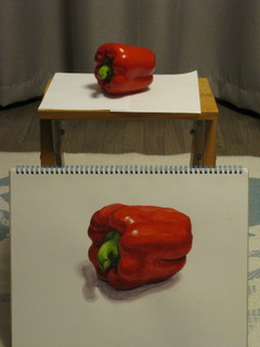 27 September 練習する人 こんばんわ。マシヤマです。しばらくぶりにデジカメの過去の写真を見ていたら、自分の描写・着彩が出てきました。自分の予備校時代の作品でも、学生時代の作品でもありません。アスクで講師を始めた4年前に「ちょっと私も練習してみよう」と夜中にちょこちょこ描いていたものです。描き出しから30分〜1時間程度の一点もチーフものが多く、あきらかに途中ですが……どうでしょう。(パプリカのみ完成させました) 最後まで描けよっ!という声が聞こえそうですが……いいのいいの、練習だから。描いている最中に意識することは、完成予想図を思い描きそこに向かって作業する。なので「あ、完成形が見えた」となったところで描くのを止める。それを何度もやってみました。描き出しは全く先が読めないので不安なのです。だから描き出しのみを練習しました。全体が見えてきたら安心が広がる。「このまま進めれば良いんだな 最終的にはココを細密に描きたいな」と。自主練習は効率良くやりましょう。寝る前に手のクロッキー1枚だけでもいいし、休み時間に鉛筆の筆圧研究を1分でもいい。自分の不安をなくすためには自分で何かしないとなりません。蒔かない種は芽を出さないのです。マシヤマ [0回] 2013/09/27 (Fri) 23:14 日常の出来事 Comment(0)