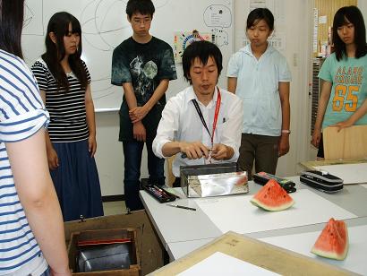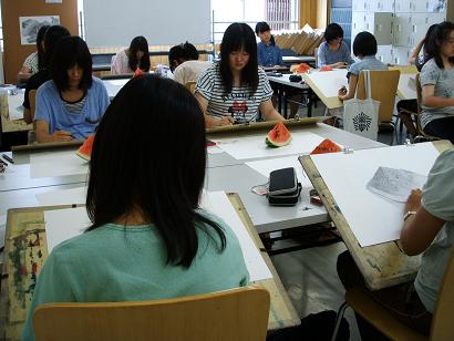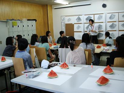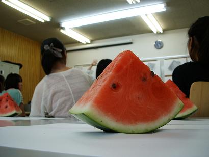 15 July 七条 ハードな月曜 七条校 無料デッサン講座かねがね、字は体を表すと申します。ASKで生徒の作品を見ていると、作品がその人を写し出しているなと思うことがよくあります。科学的裏付けはありませんが、そう思うのです。あの生徒らしい作品だったな、とか今日は少し落ち着きがなかったな、だとかあいつ成長したなあ、だとか帰りの電車の中、くたくたの私はそう思っているのです。一年、ひとによってはそれ以上の期間、その生徒の作品を通して、人の成長を見ているんですな。シャツの中身は心行き、こんにちは田和です。今日は無料デッサン講座が開催されました。七条校にもニューフェイス!の皆々様にお集まりいただき、夏の味覚”スイカ”を描きました。途中、参加してくれた生徒に面談をしていると、「まだ私下手糞で、、、><」と、今日の出来栄えを気にしている生徒や「もうすぐ受験だけど、やばいですか!!??」と、やる気満々の生徒もいたり色々な声を聞くことができ、私お腹いっぱいでございます。その後、描いたものを食べて帰った皆々さま。心もお腹も満たされたでしょうか?ちなみに、私はスイカが嫌いです。(スイカバーなら食べてやってもいい)夏期・第1期間の平日もスタートしましたよ!!田和 [0回] 2013/07/15 (Mon) 18:09 アスクでのこと Comment(2)